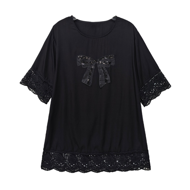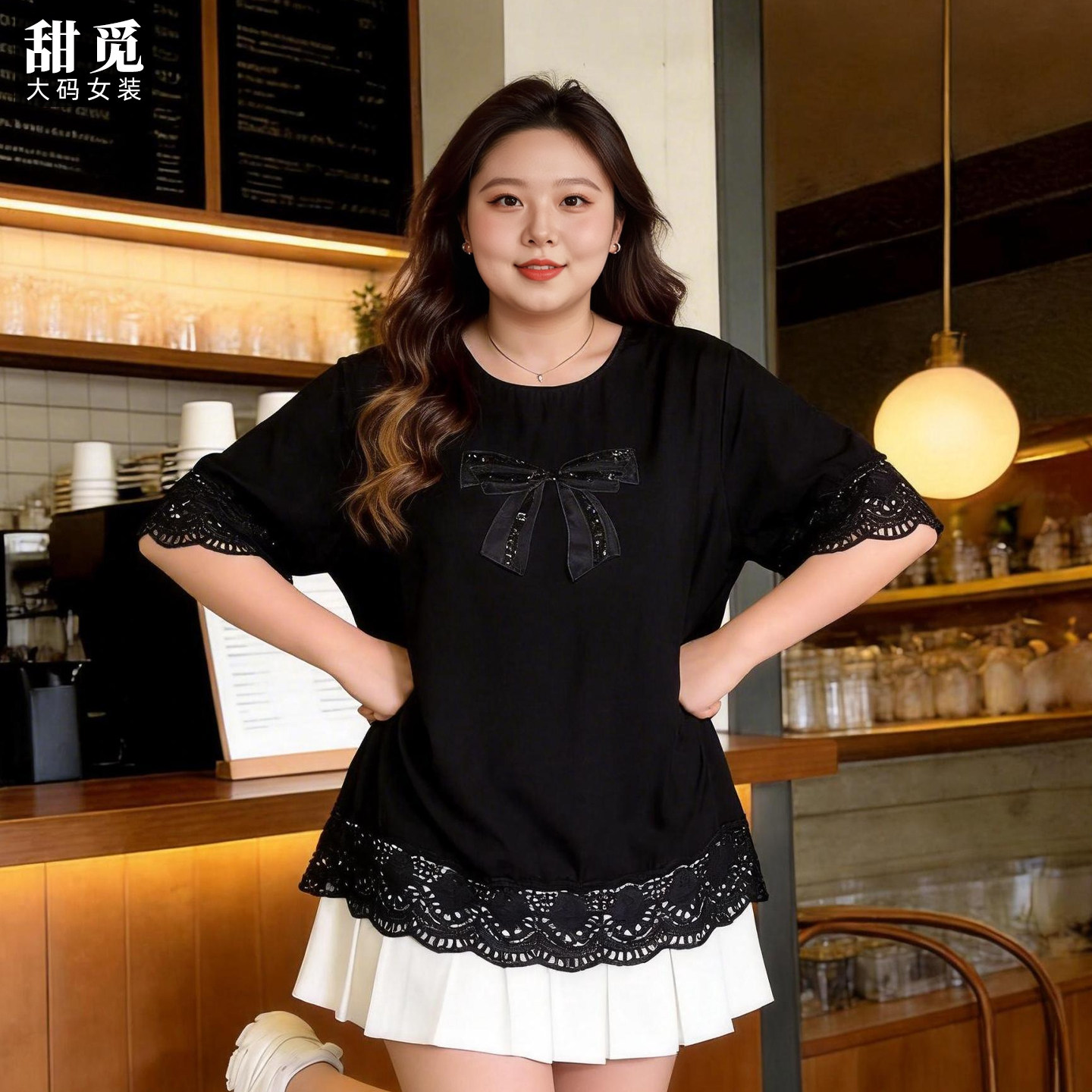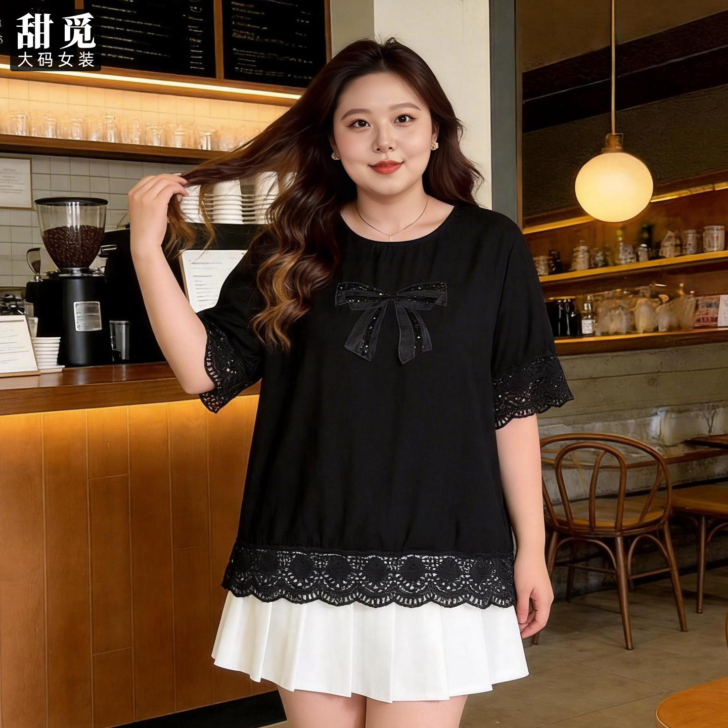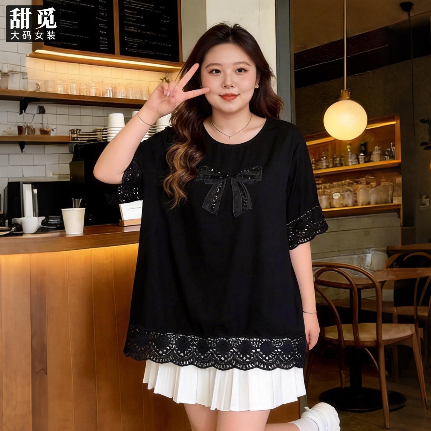 📚 甜觅特大码女装夏装胖mm300斤蕾丝拼接蝴蝶结珠片刺绣宽松显瘦T恤