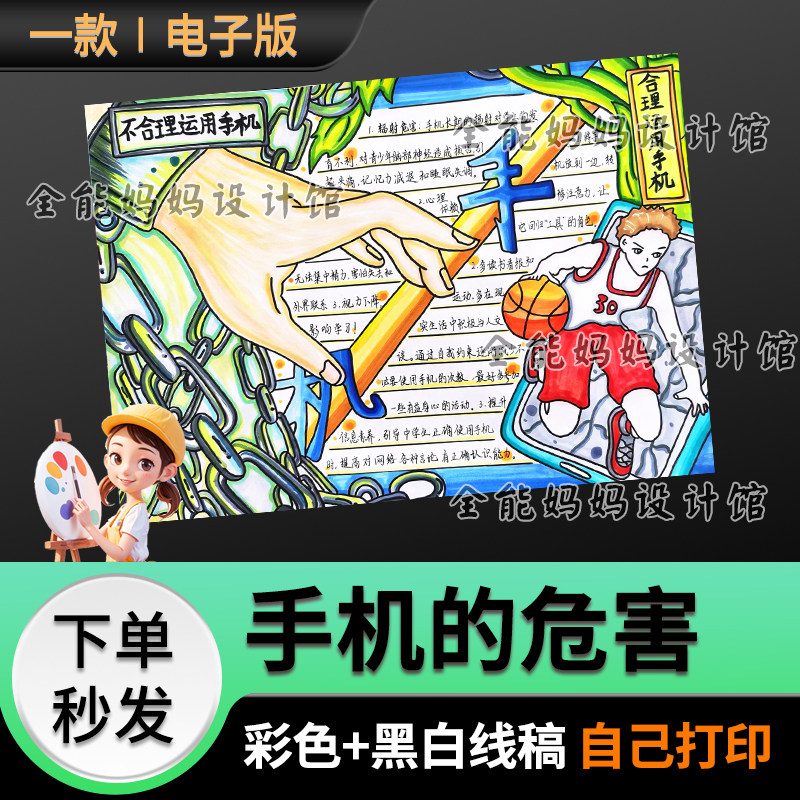 📚 合理使用时机手抄报模版手机的危害电子小可打印黑白线稿6069