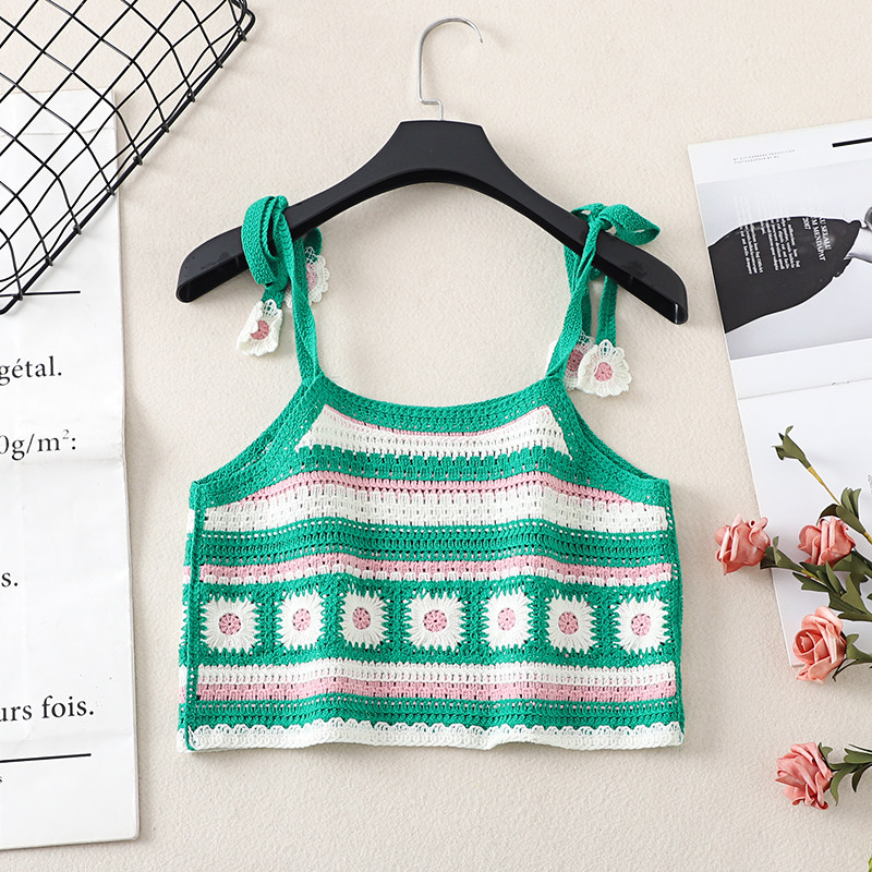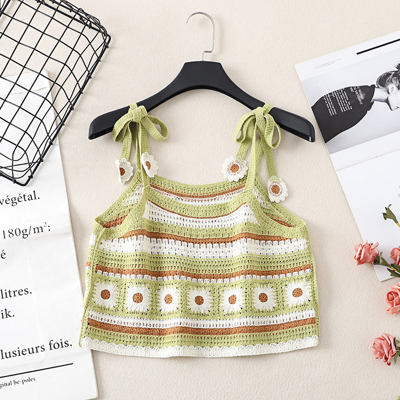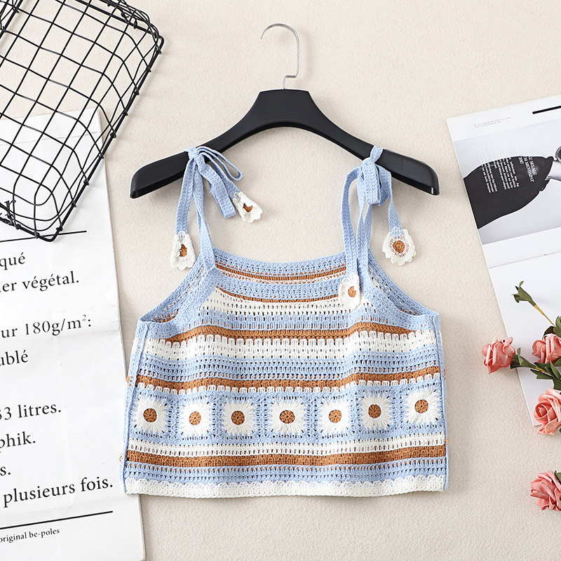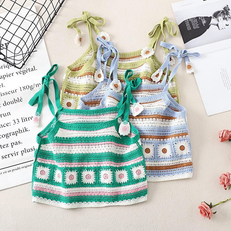 📚 绣花吊带女夏季度假森系慵懒风花朵无袖短款针织钩花背心镂空上衣