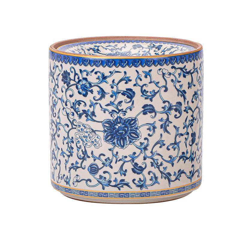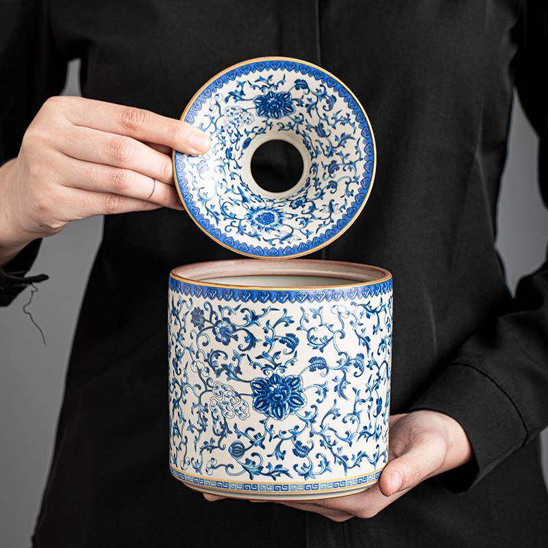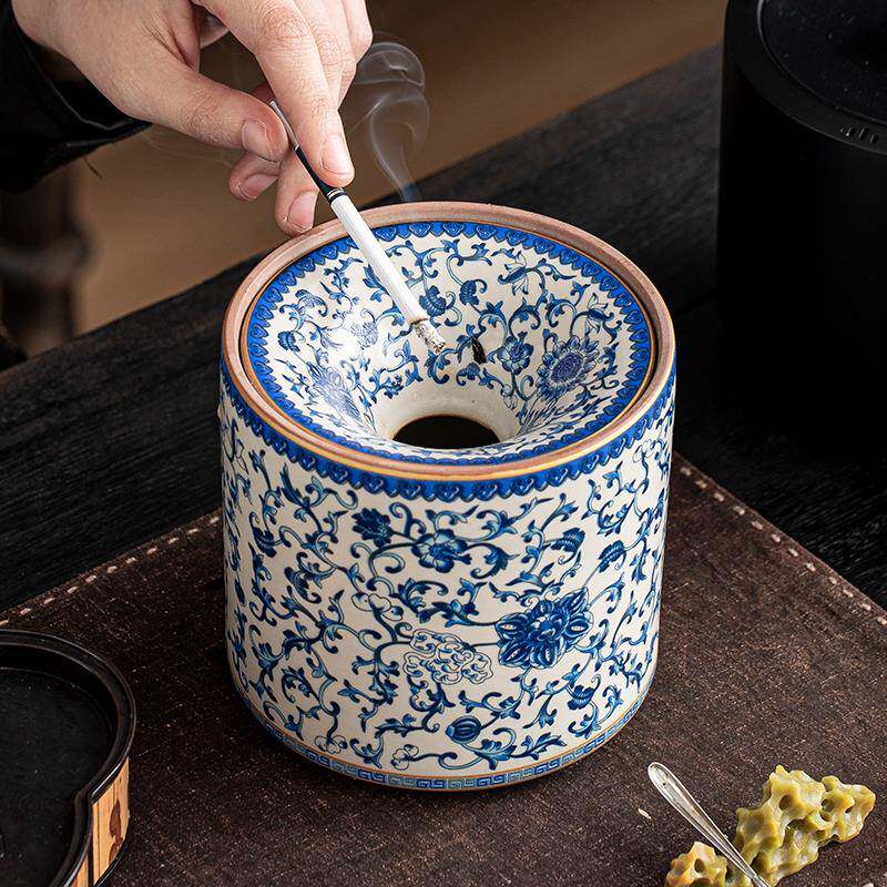 📚 汝窑青花缠枝莲漏斗式烟灰缸大号带盖防飞灰家用客厅创意个性烟缸