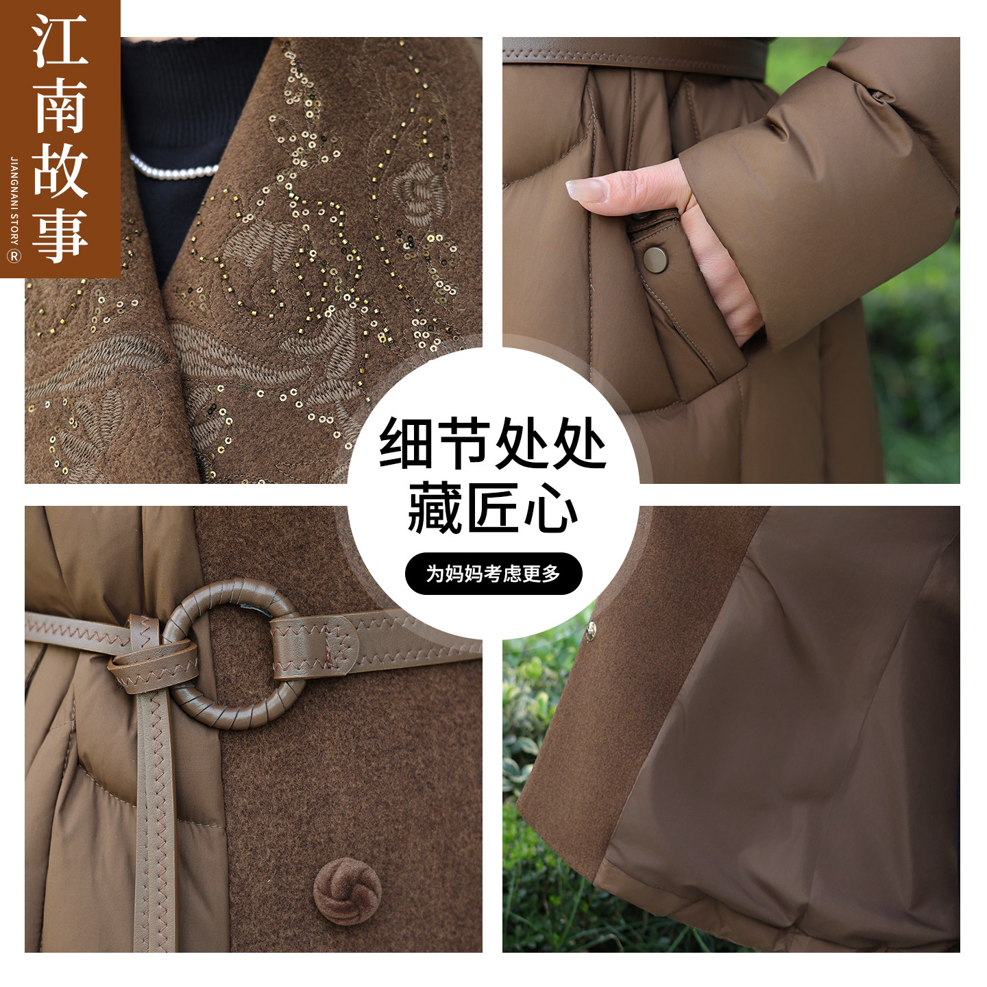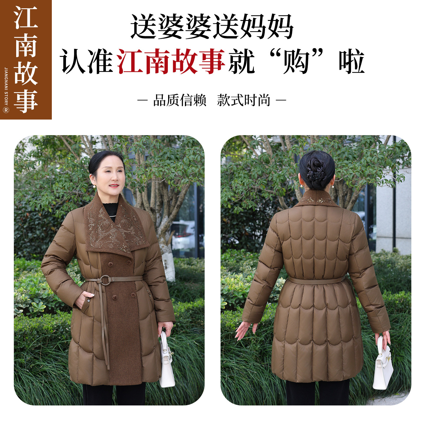 📚 【江南故事】90白鸭绒中长款羽绒服女中老年妈妈收腰翻领外套