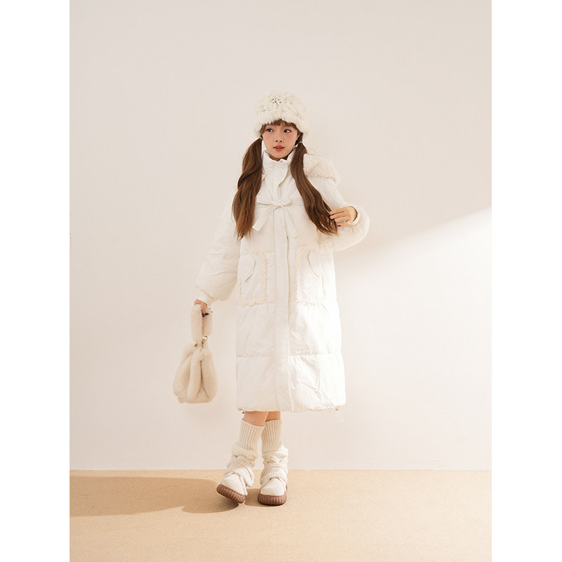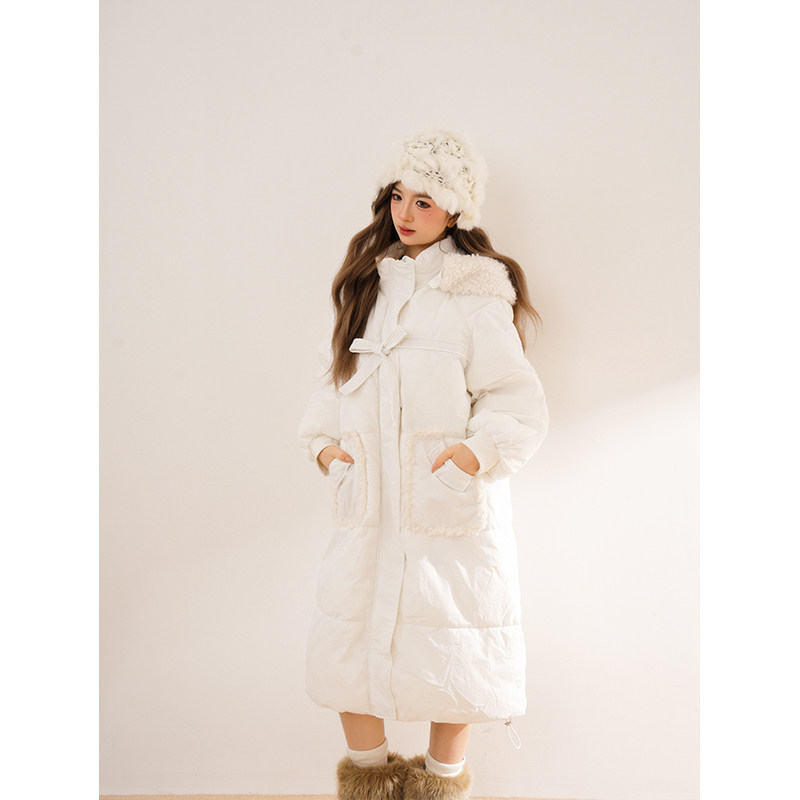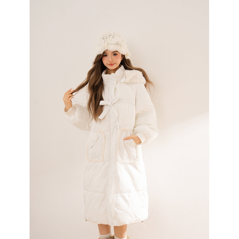 📚 【恰逢晚冬】白色加厚中长款连帽棉服女冬季新款韩版小个子外套