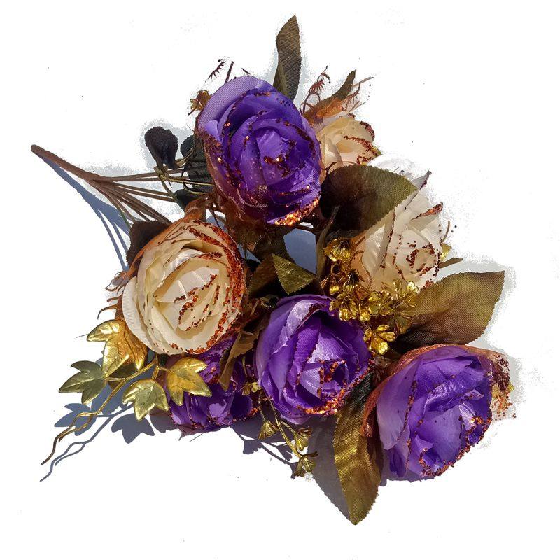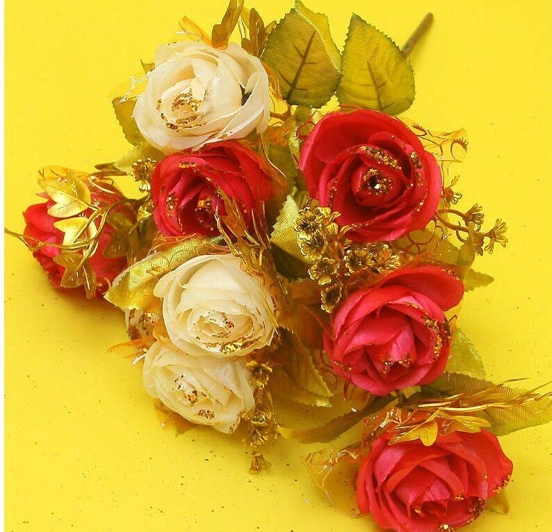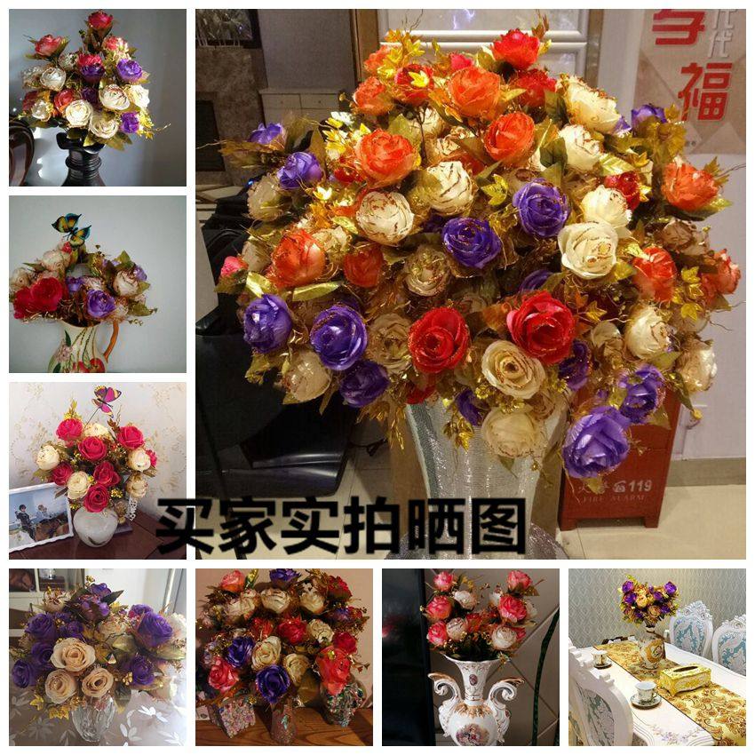 📚 欧式金粉仿真花束餐桌假花客厅茶几婚庆装饰金叶玫瑰插花绢花摆件
