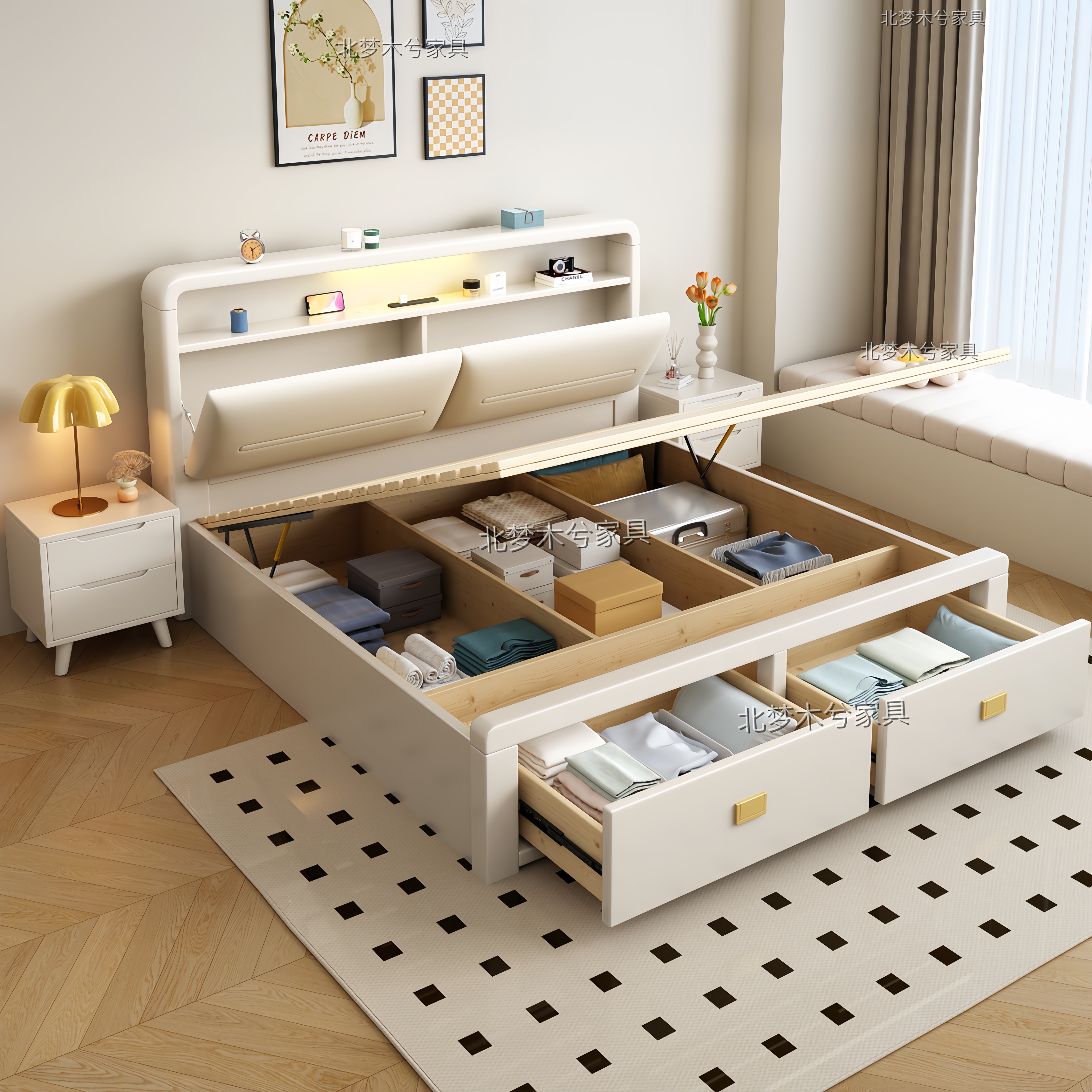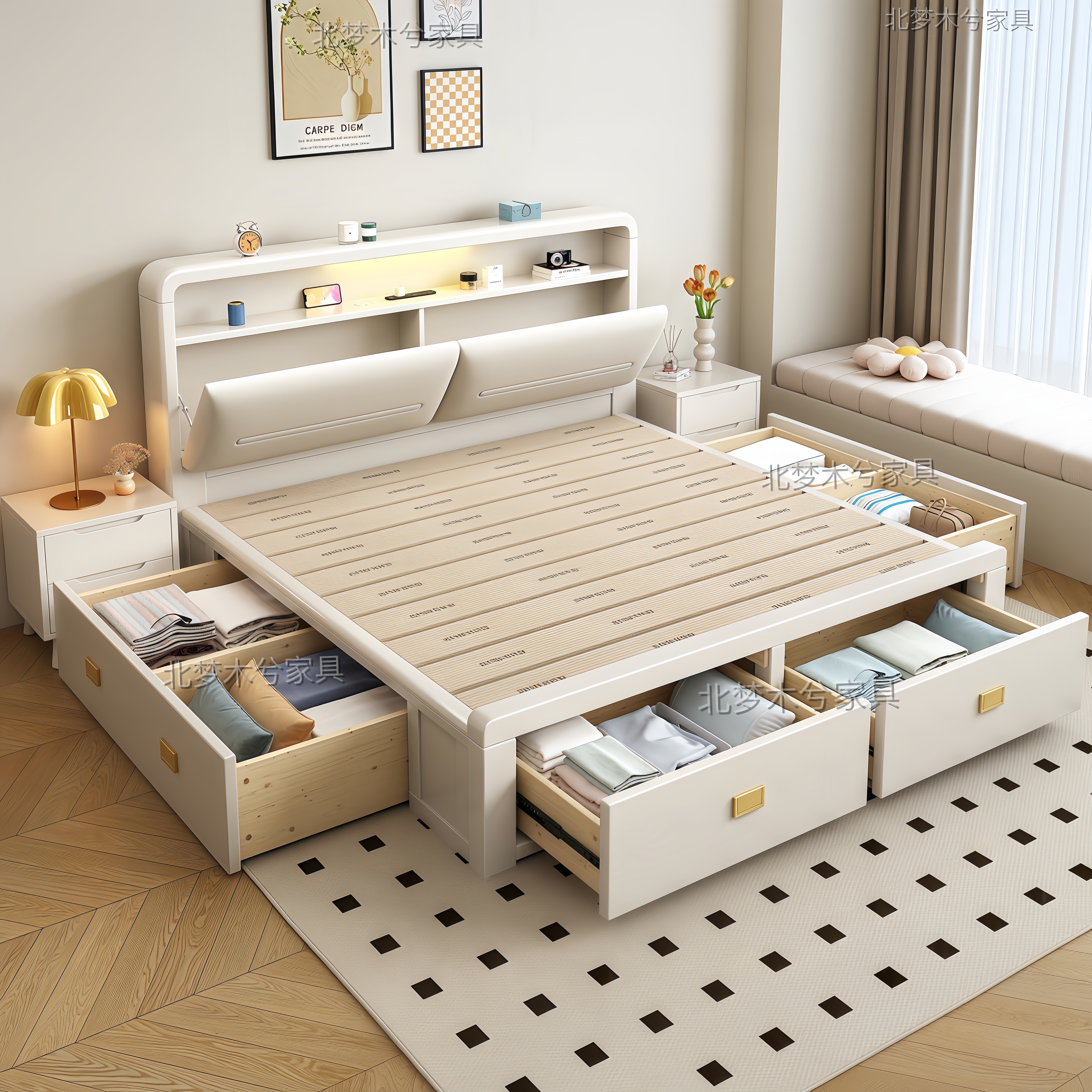📚 北欧实木床1米5抽屉储物2025新款简约白色1米8双人床带夜灯插座