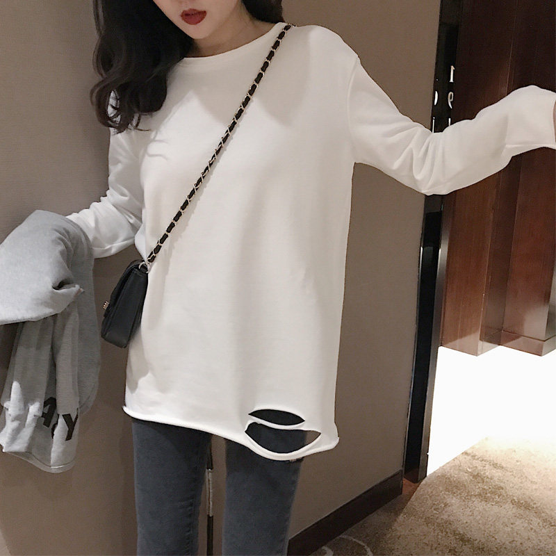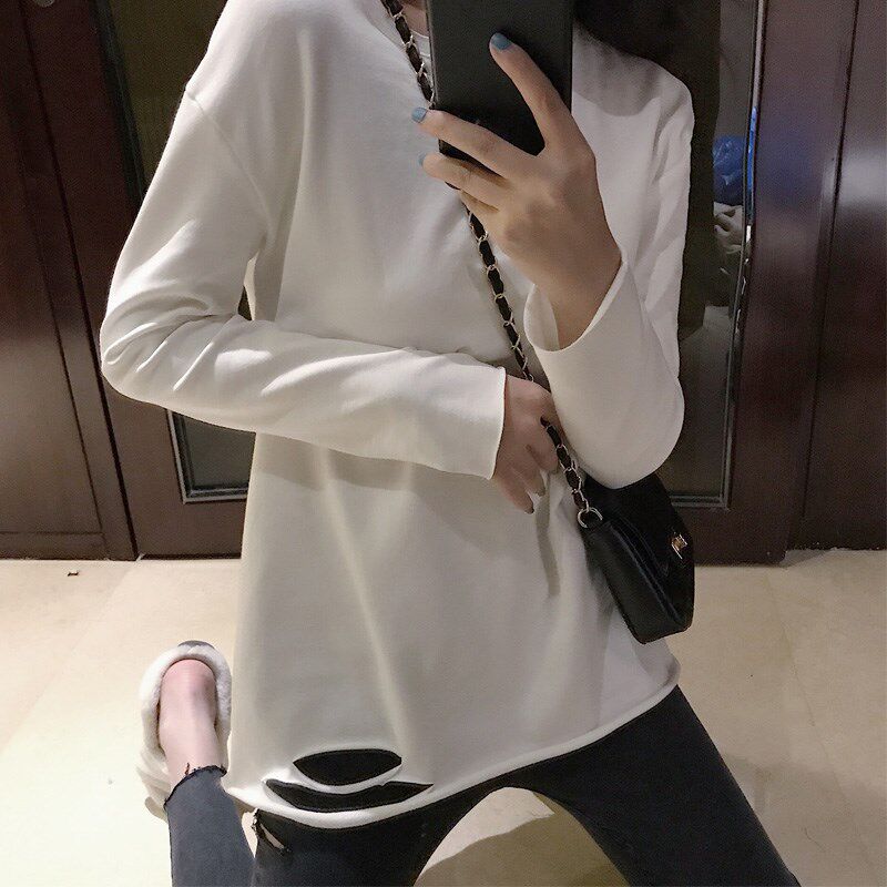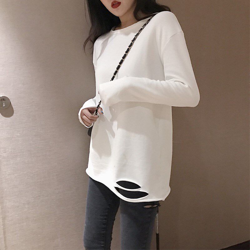 📚 2024秋冬白色纯棉长袖T恤宽松破洞洋气破烂打底衫内搭叠穿上衣女