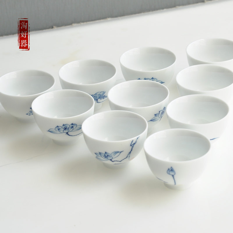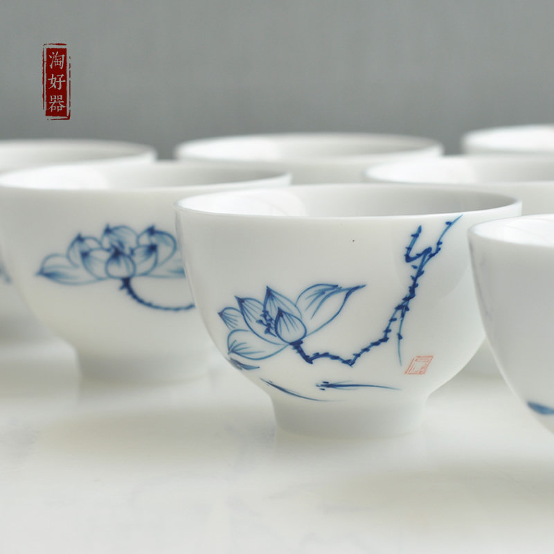 📚 景德镇手绘白瓷青花瓷大号茶杯陶瓷荷花闻香杯茶碗茶盅品茗个人杯