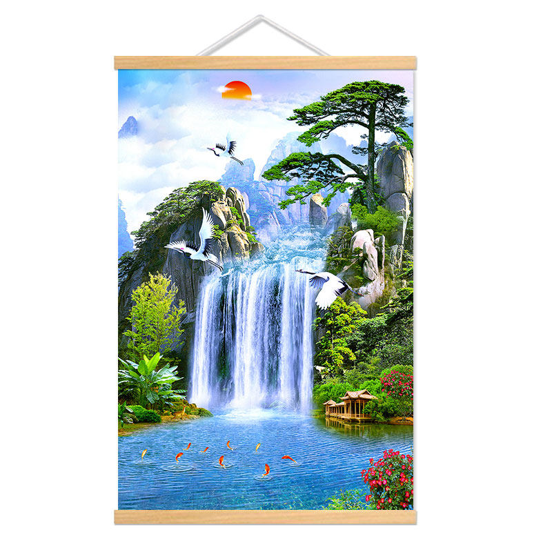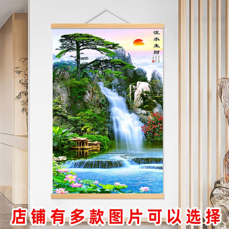📚 山水画风景画客厅装饰挂画迎客松流水生财八骏马办公室背景墙风水