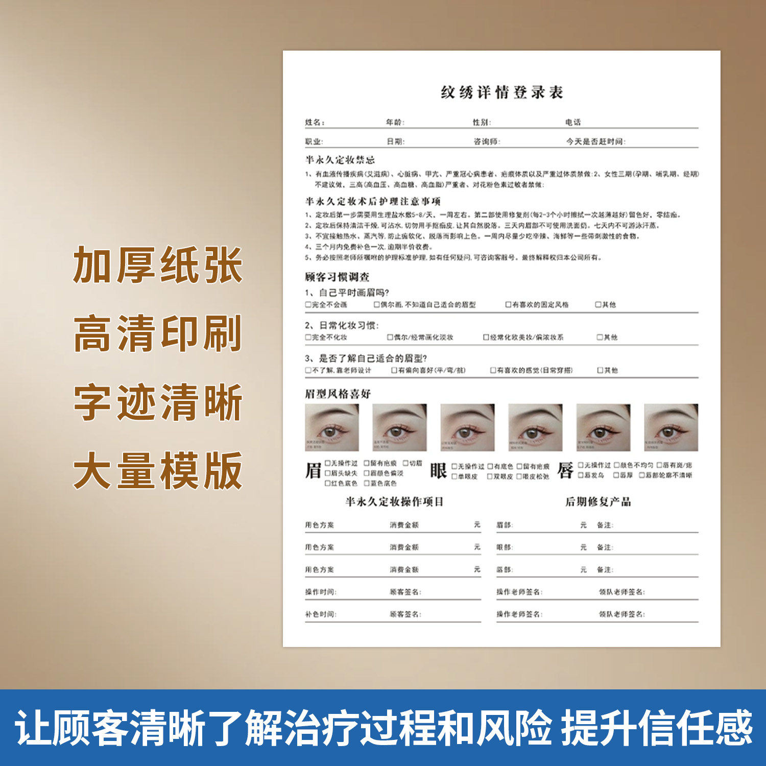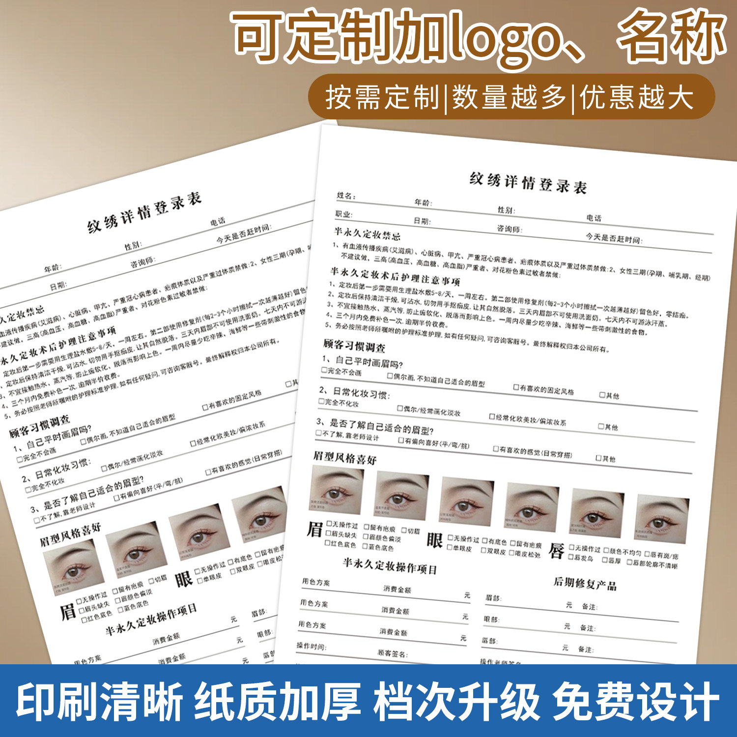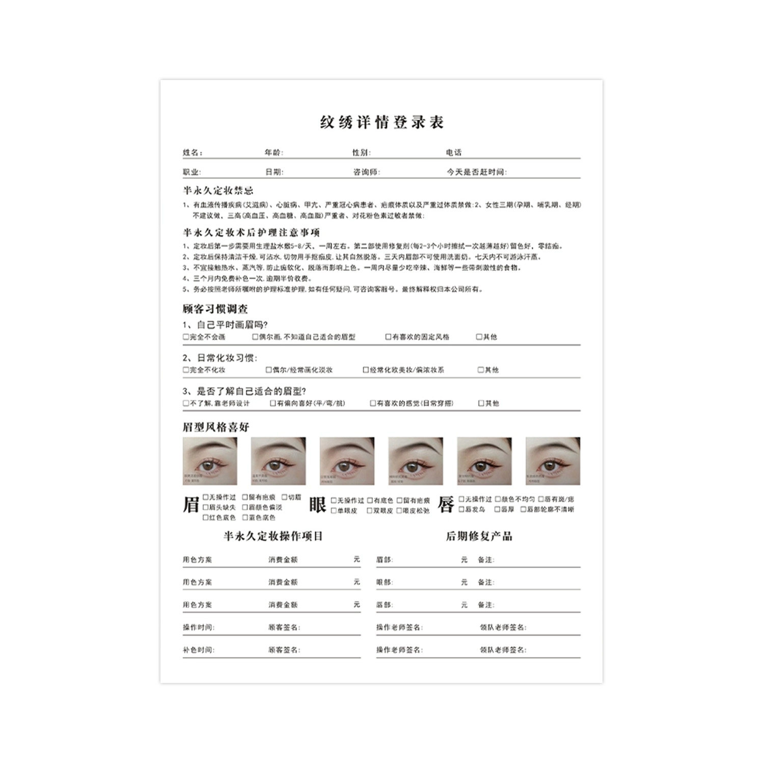 📚 新款纹绣登记表美容院半永久纹绣咨询单可定制纹眉纹唇美学设计单