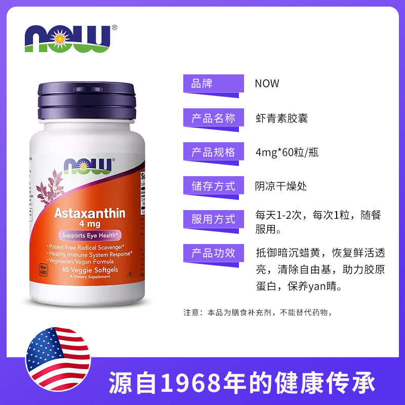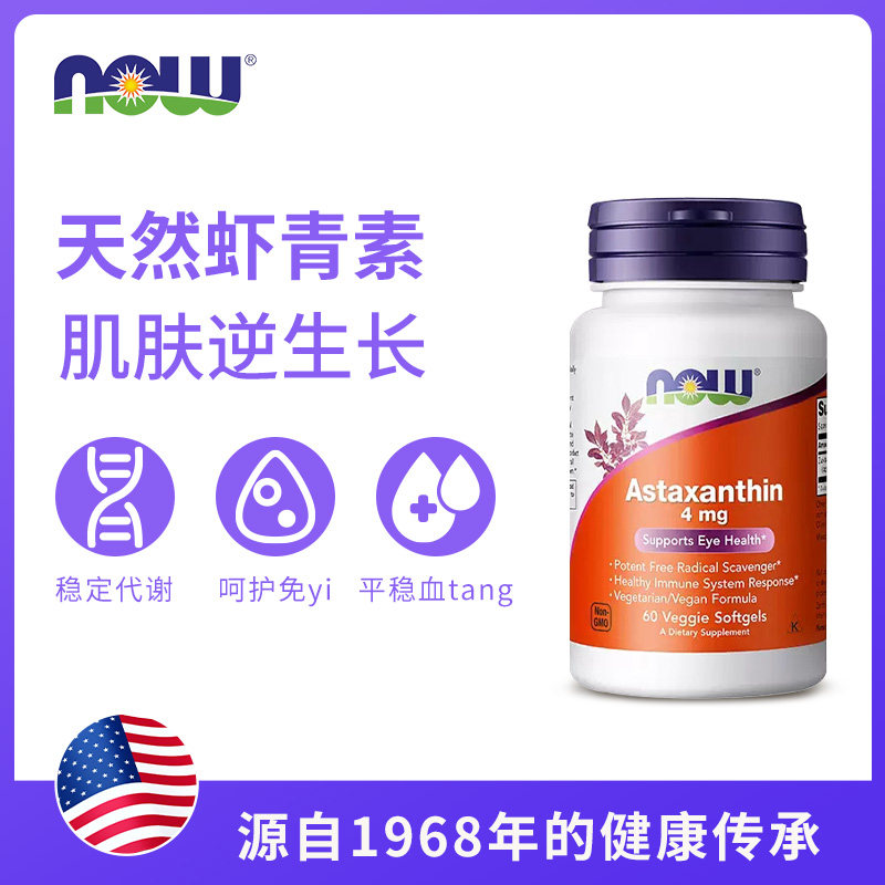 📚 美国now foods诺奥Astaxanthin虾青素4mg60粒胶囊天然雨生红球藻