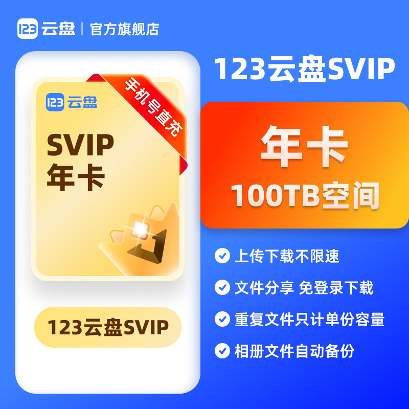 📚 【官方直充】123云盘会员SVIP年卡100TB存储网盘私人企业云盘空间