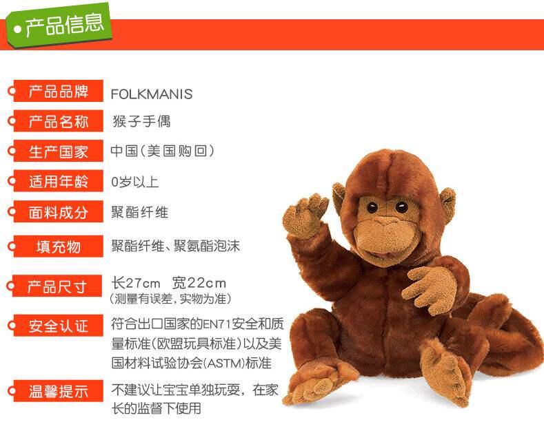 📚 (现货包邮)folkmanis仿真击鼓骂曹长尾猴子毛绒玩具公仔手偶