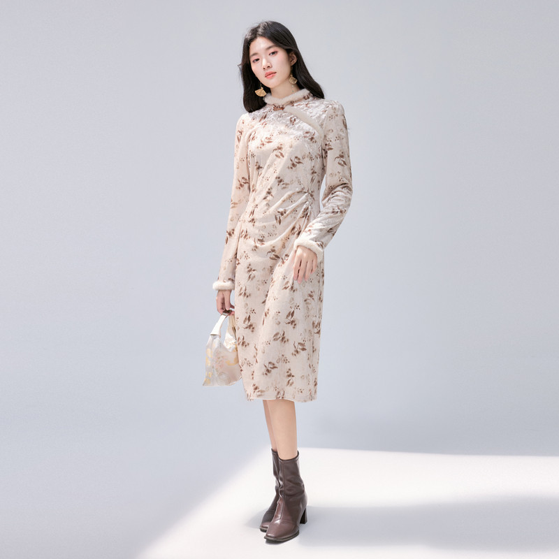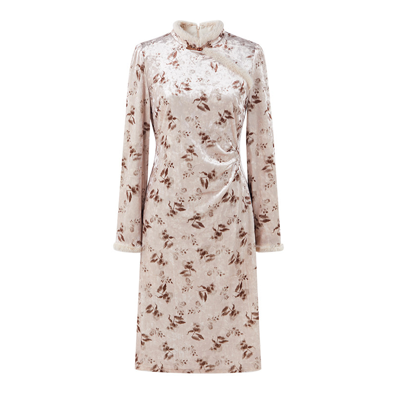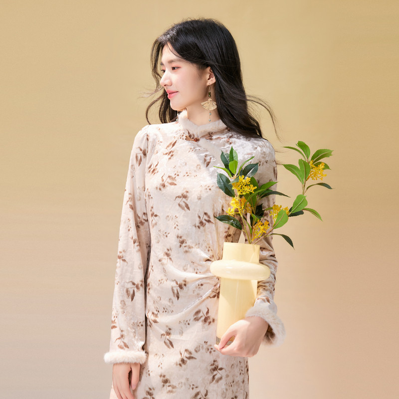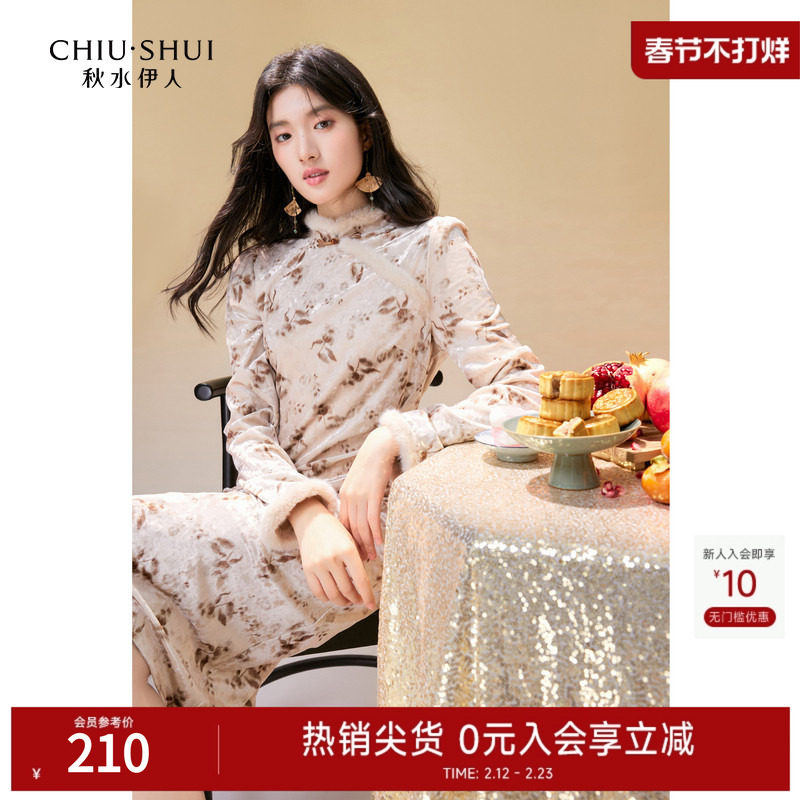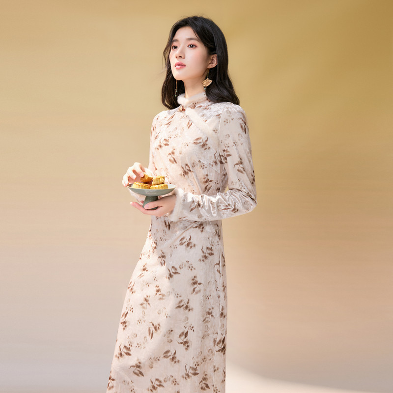 📚 秋水伊人国风复古丝绒连衣裙2024冬装新款女新中式立领气质旗袍裙