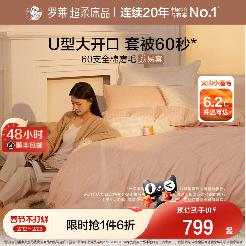 📚 罗莱家纺U易套秋冬磨毛加厚全棉四件套纯棉60支超柔被套保暖套件