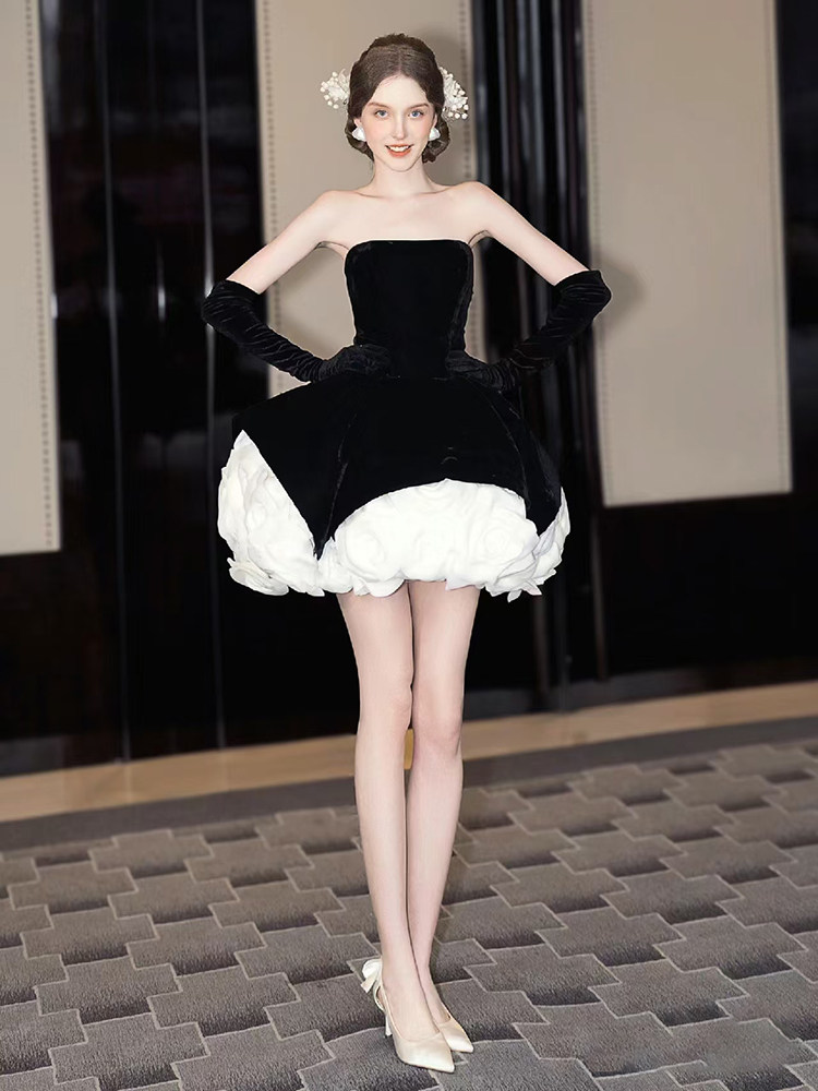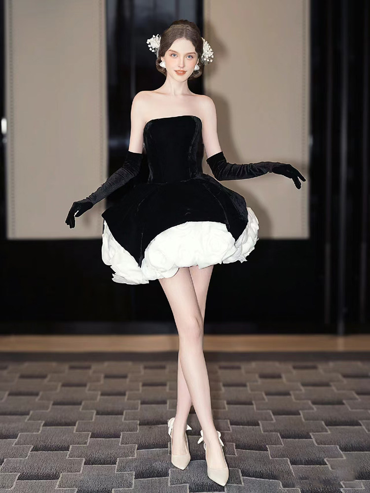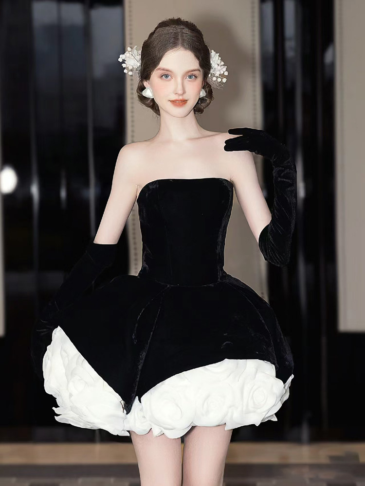 📚 黑色显瘦晚礼服小个子女高级感抹胸丝绒气质高端生日礼服公主裙