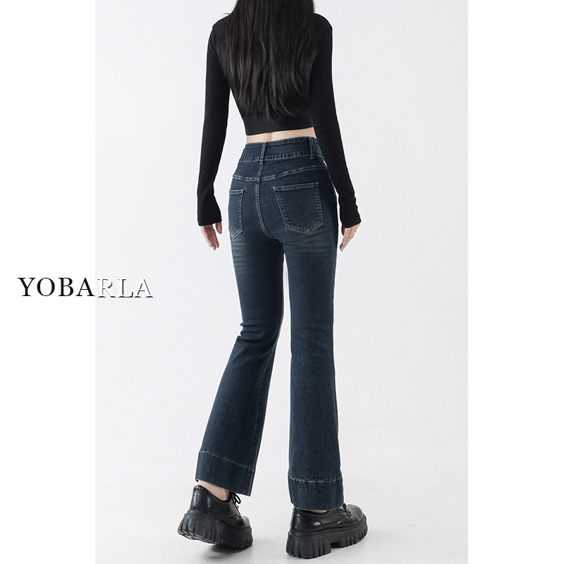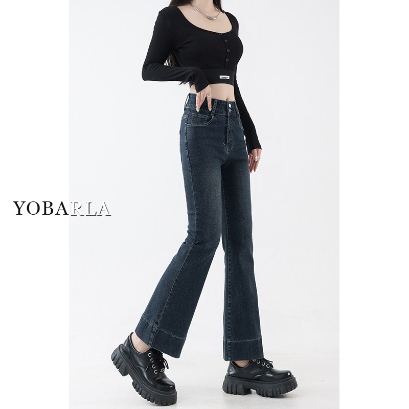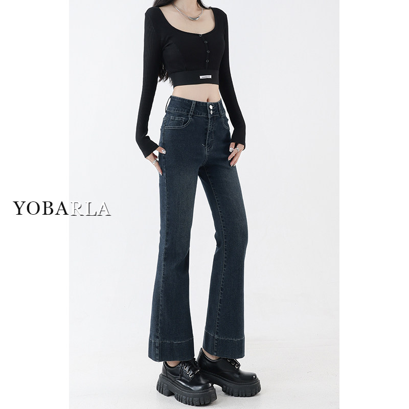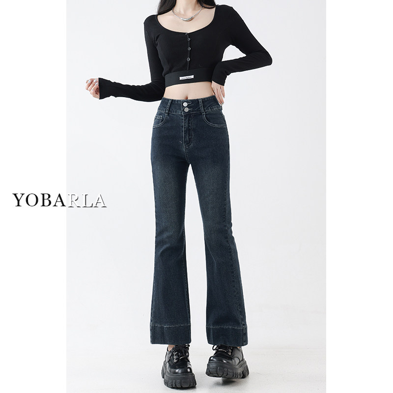 蓝灰色喇叭裤弹力牛仔裤秋冬