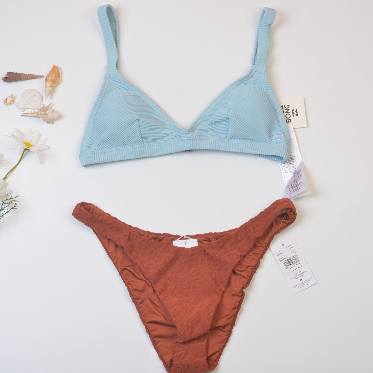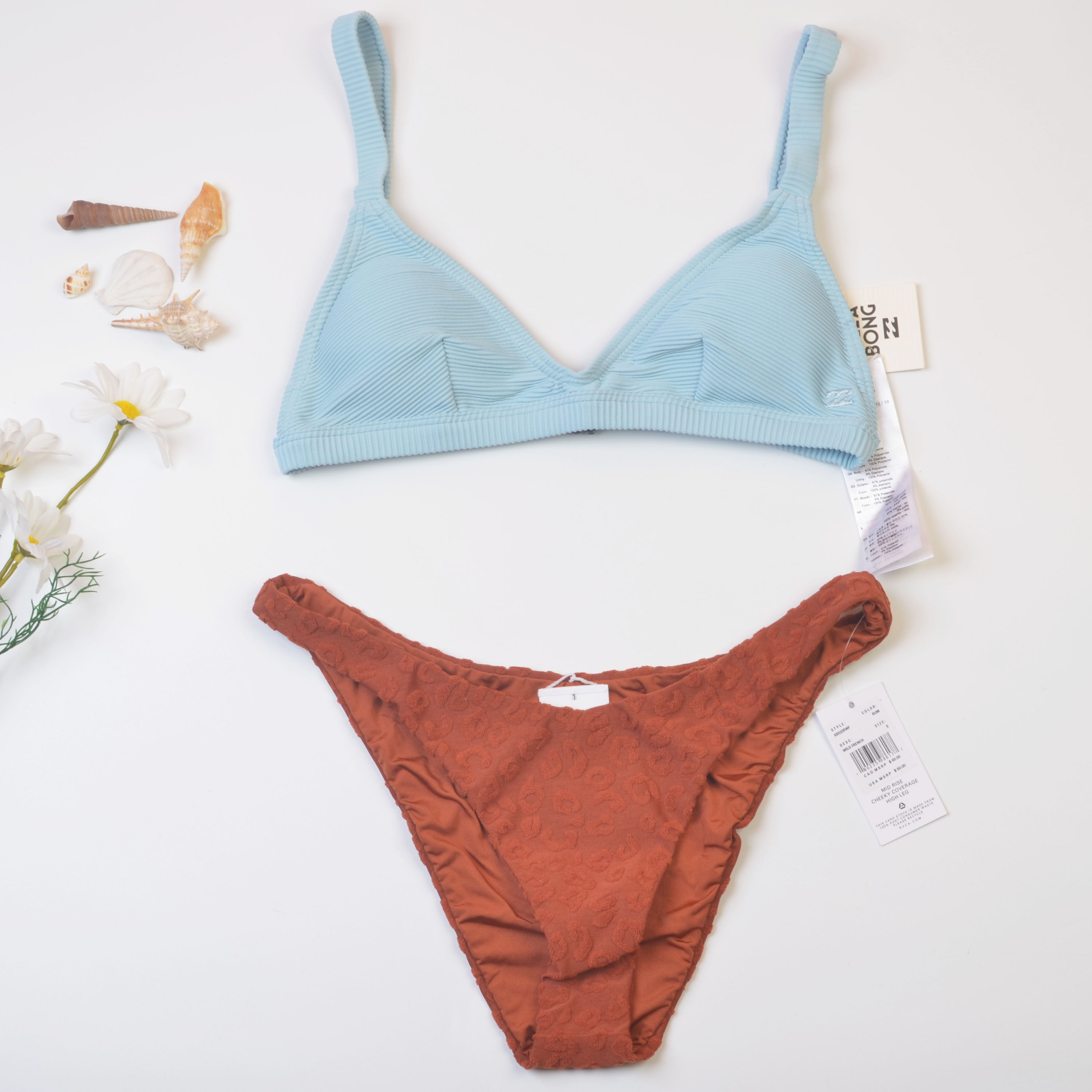📚 澳洲品牌法式撞色分体泳衣女雾霾蓝焦糖色提花比基尼度假泳装