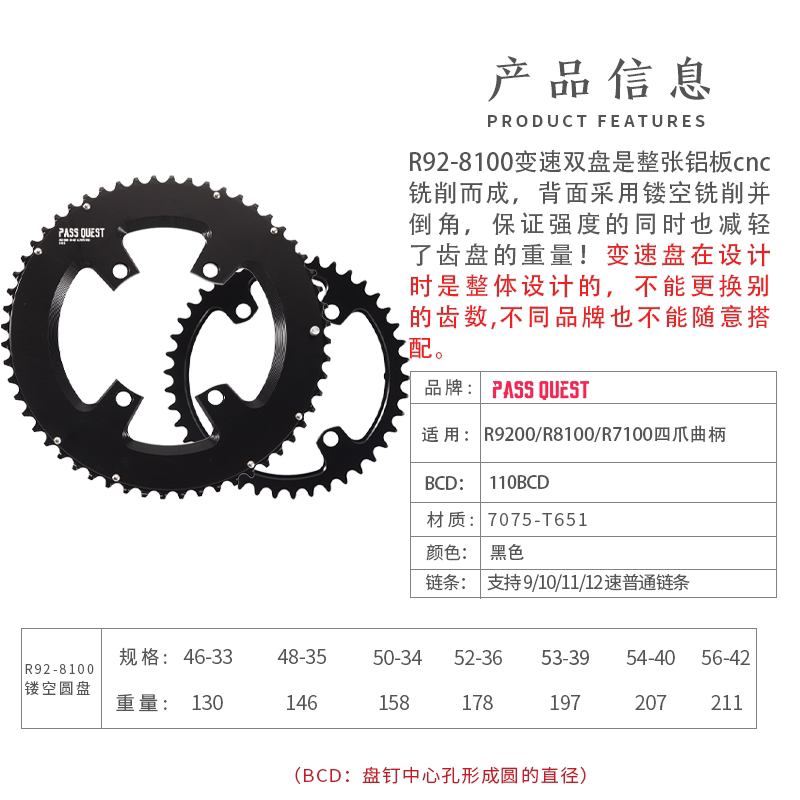 📚 PASS QUEST shimano R7100 R8100/R9200专用双盘牙盘盘片46/48/54