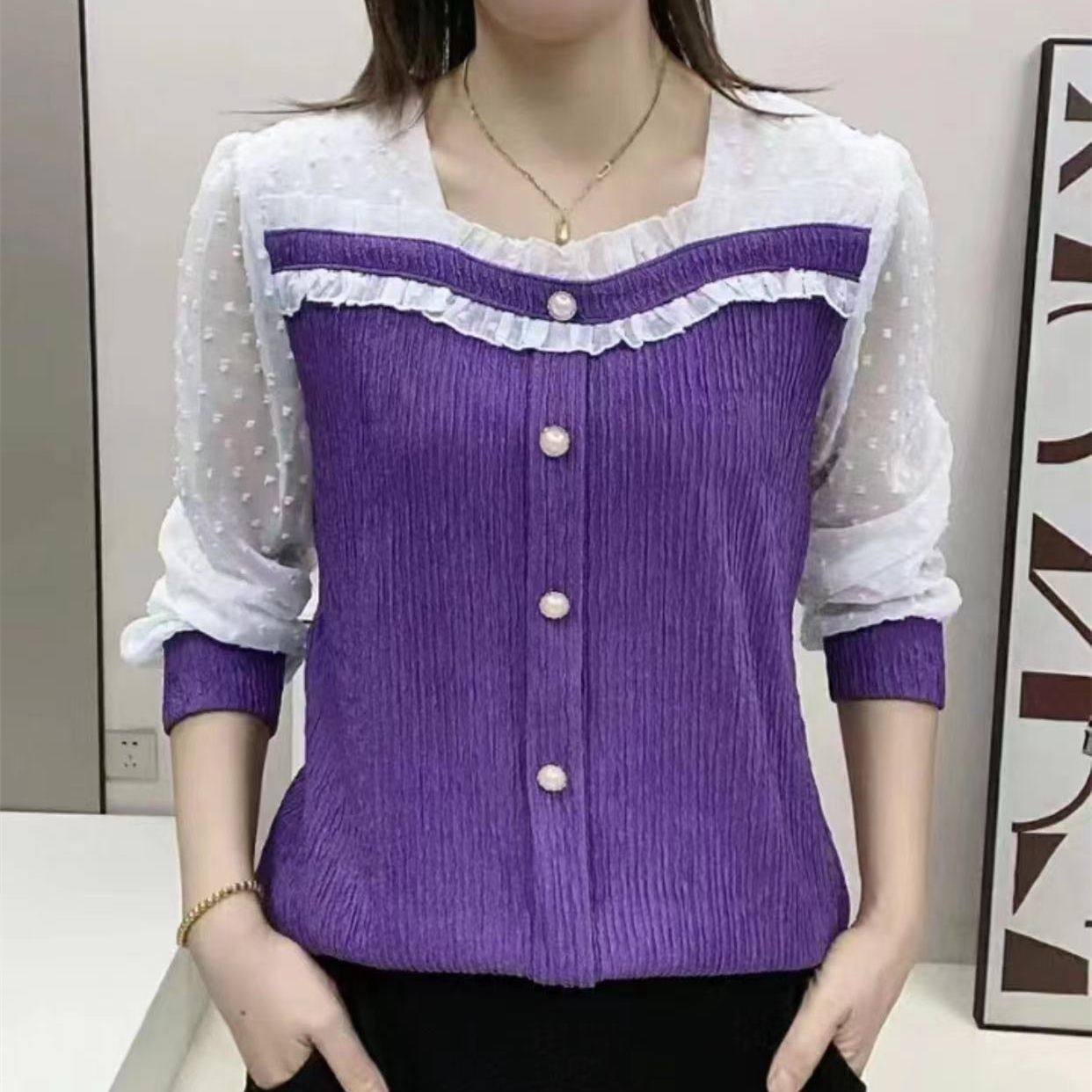 📚 方领拼接时尚洋气打底上衣小衫女士长袖蕾丝衫打底衫宽松遮肉显瘦
