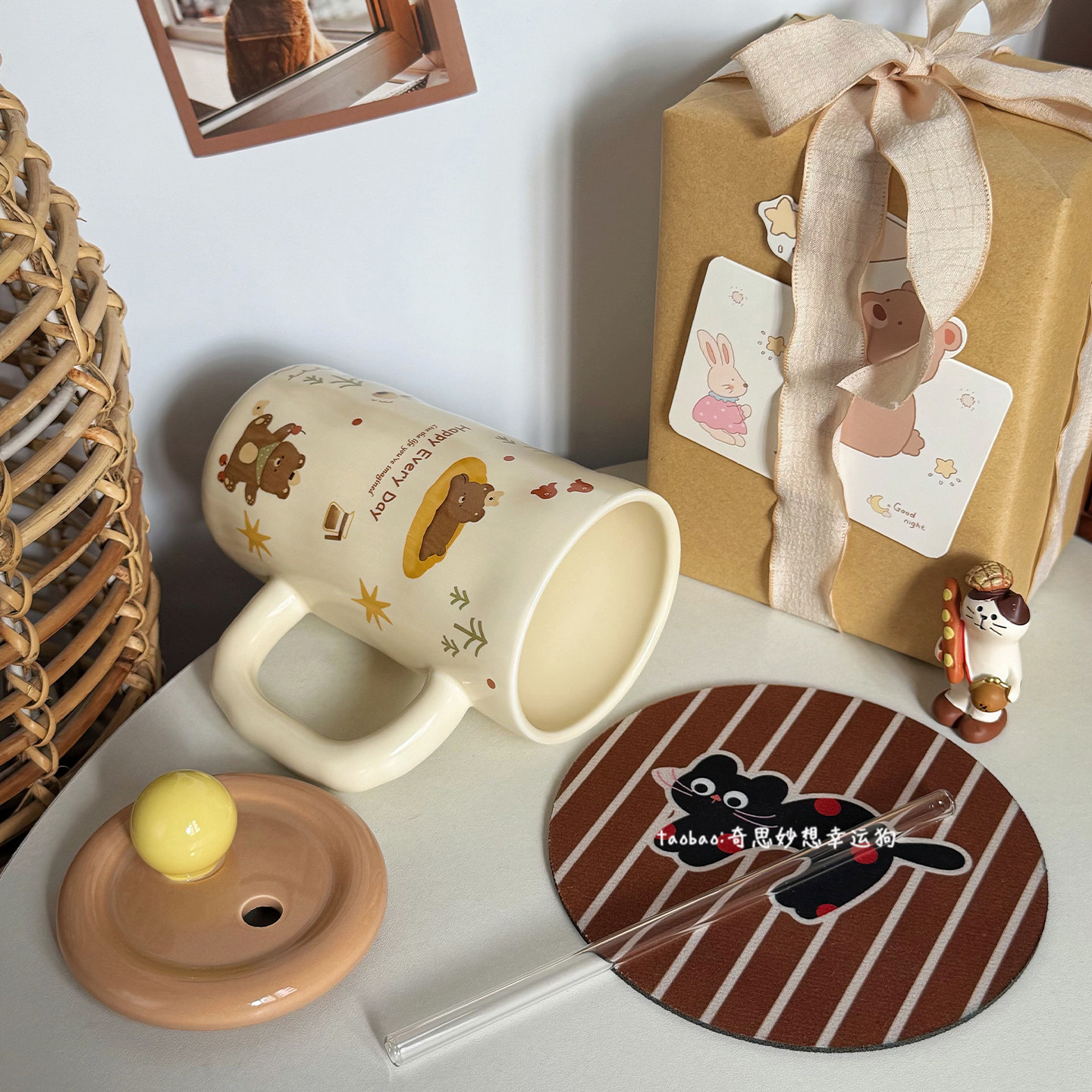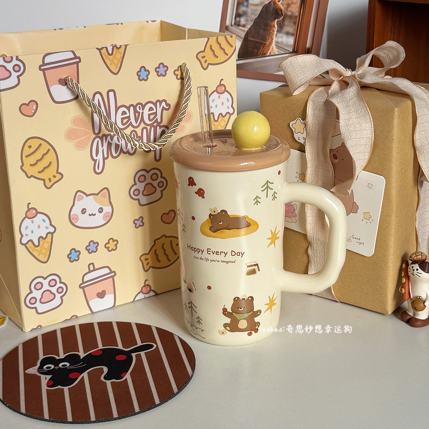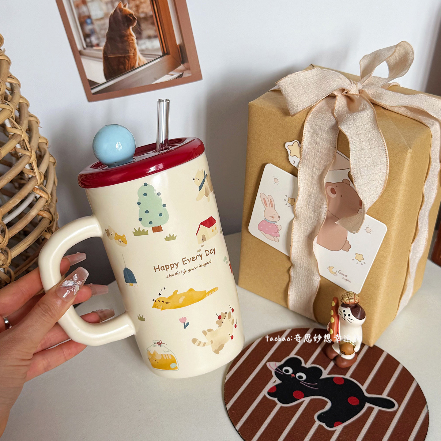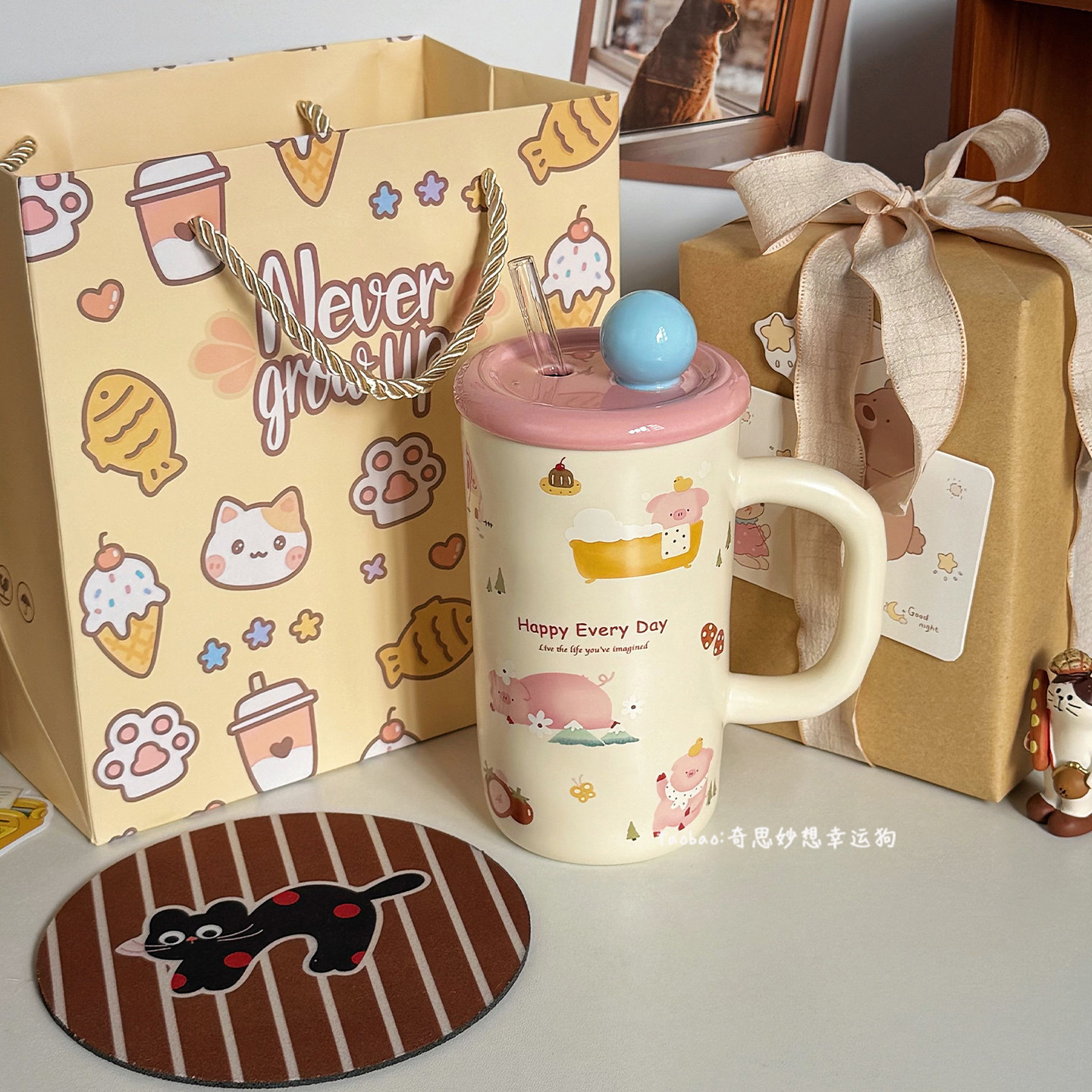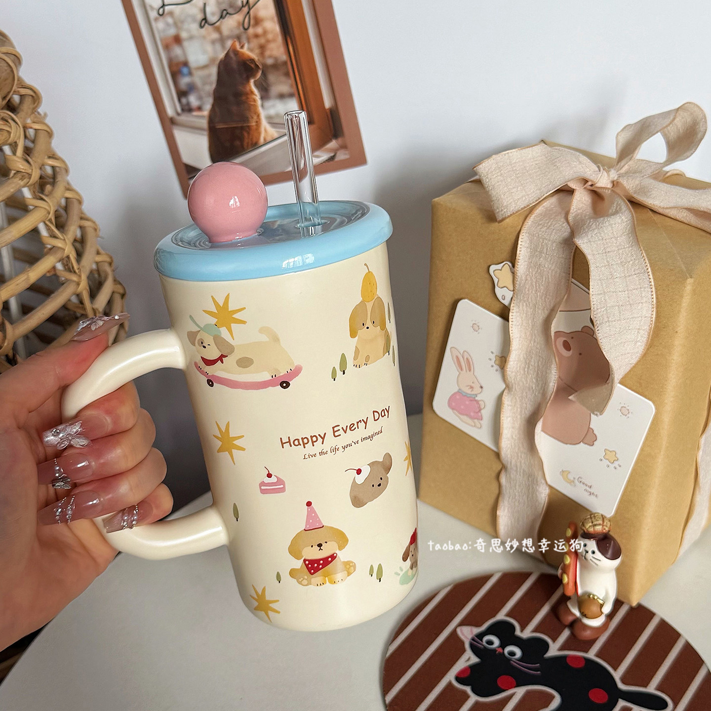 📚 可爱萌宠乐园陶瓷马克杯超好看的生日礼物送女生带盖吸管喝水杯子
