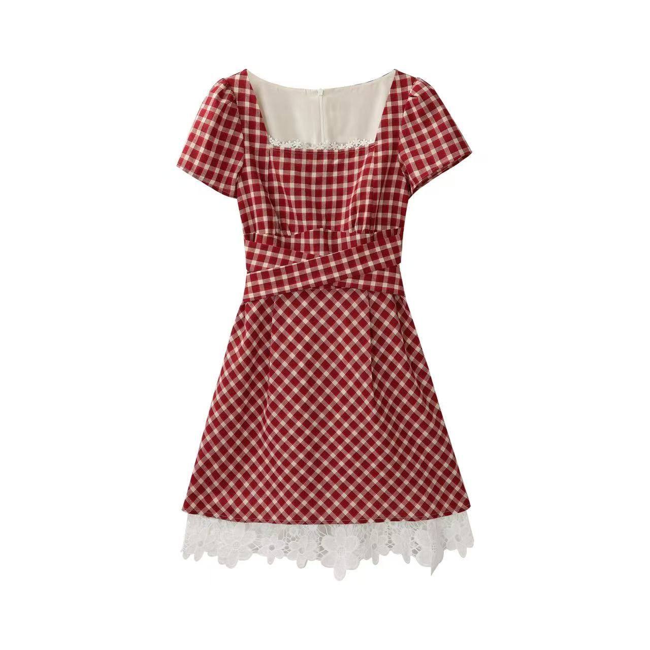 📚 法式甜美格子A字裙蕾丝拼接桔梗初恋夏季新款收腰连衣裙仙女裙子