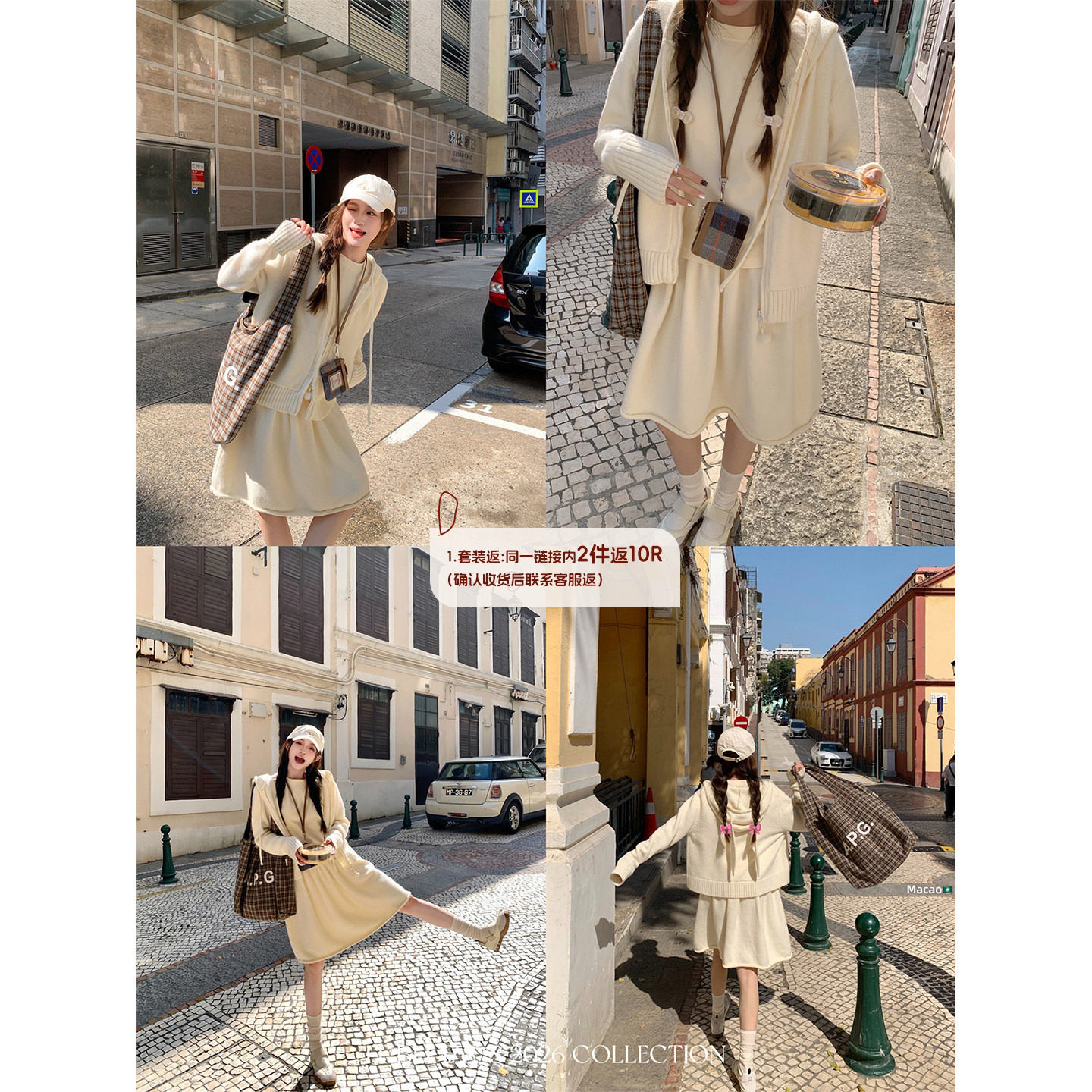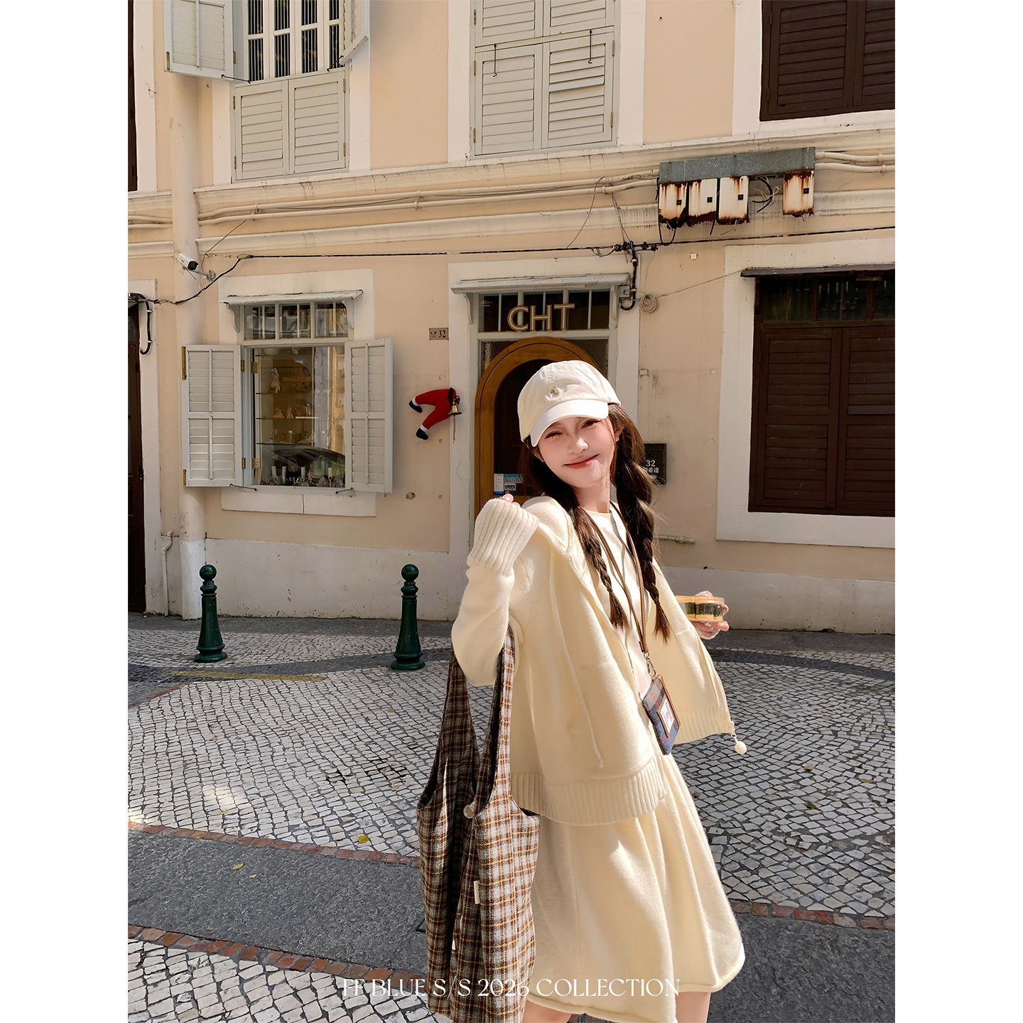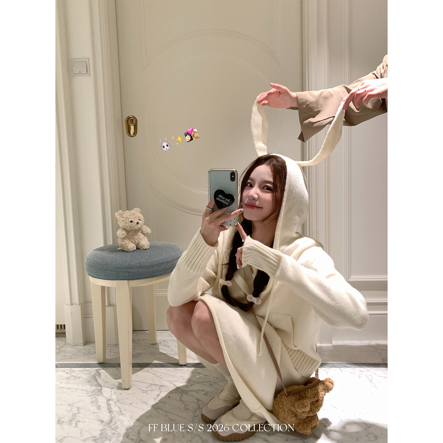 📚 FF BLUE 暖冬兔兔 奶呼呼兔耳朵连帽上衣女羊毛针织褶皱半裙套装
