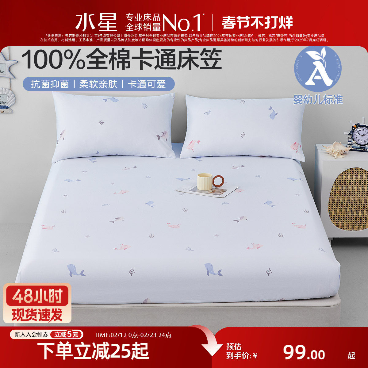 📚 水星家纺床笠单件100纯棉床罩抗菌单双人宿舍床垫保护罩床上用品