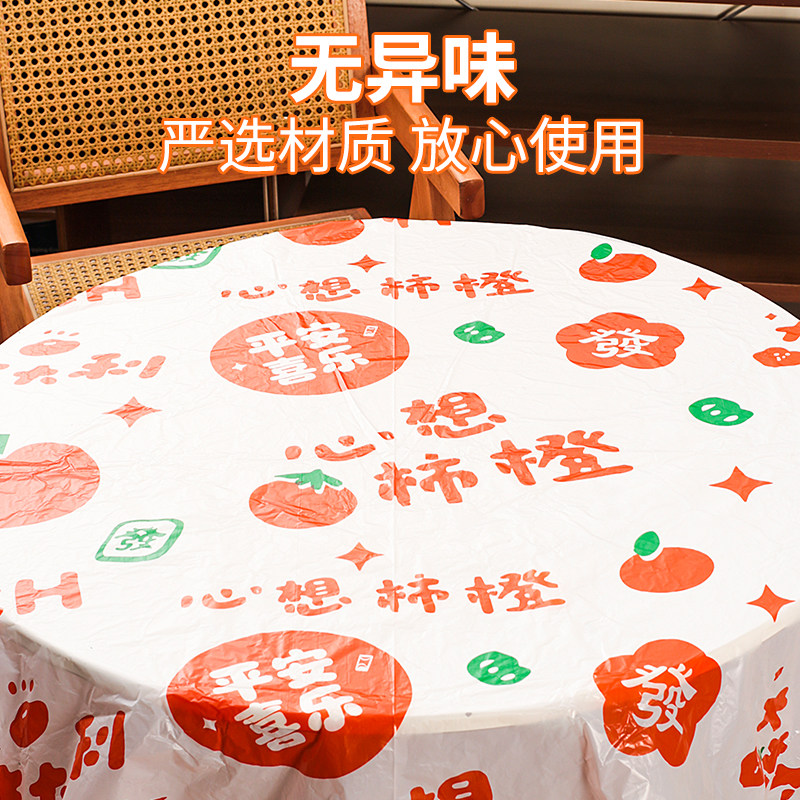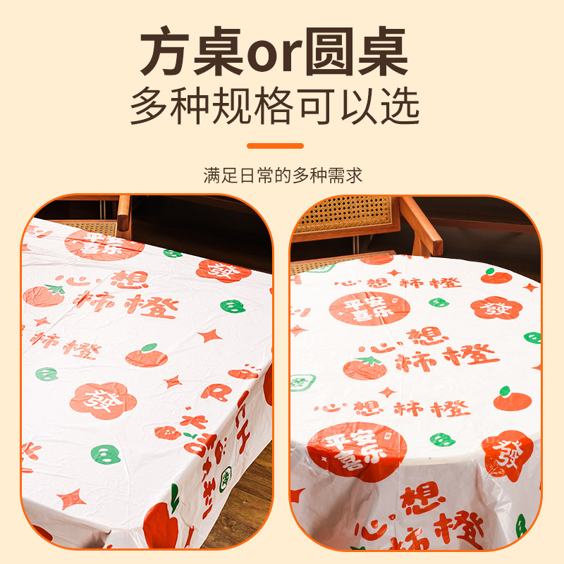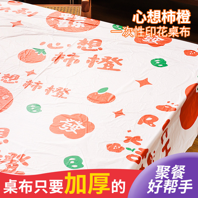 📚 一次性桌布特厚印花心想柿橙圆桌长桌塑料防水喜庆餐台布家用台布