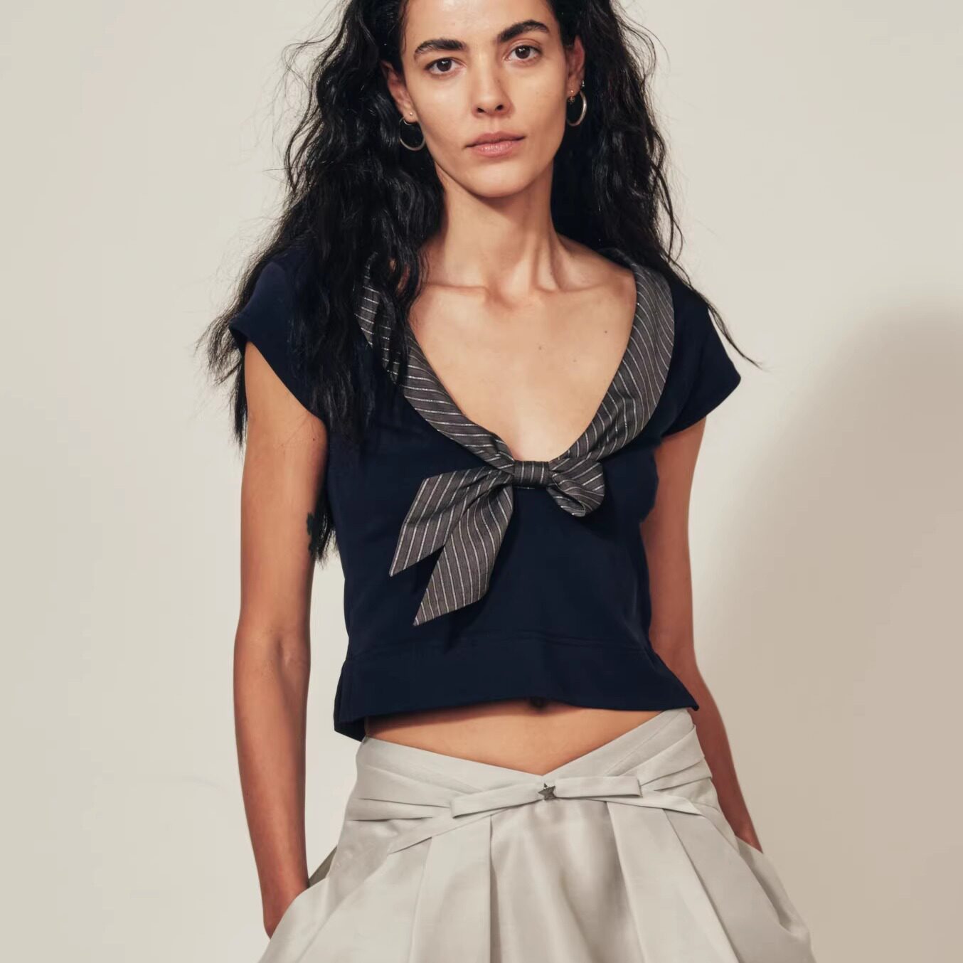 57¥ HU293 A3295S8pl1A¥ https://m.tb.cn/h.iqX2hOb MARCHEN 安格集合店 26SS春夏百搭露背飘带荡领双面穿降落上衣T恤 --------------------- 【原售价】920元 【优惠券】20元 【券后价】900元。