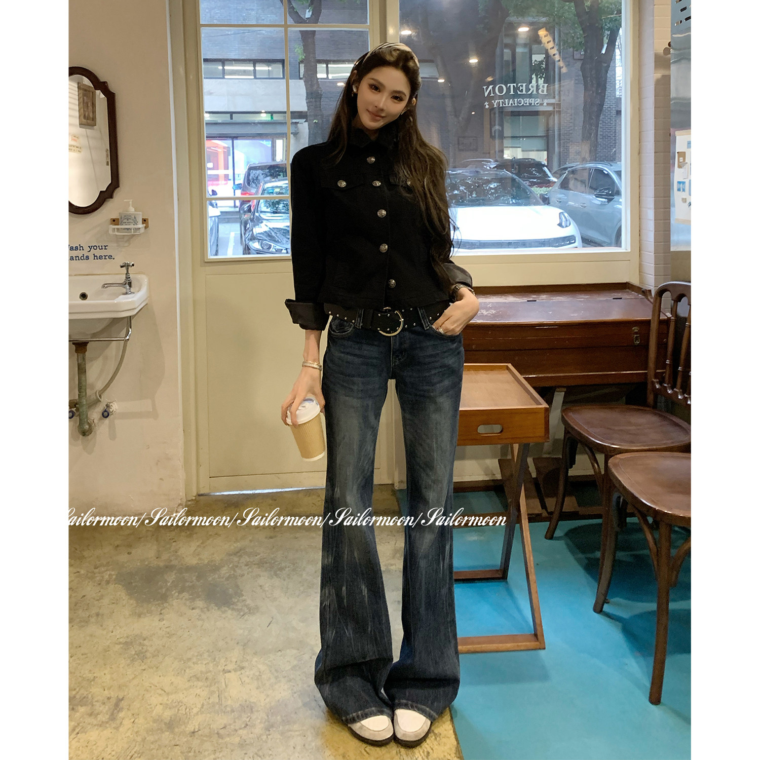📚 F PROJECT【纽约街头】闪电纹复古水洗低腰微喇牛仔裤女显瘦长裤