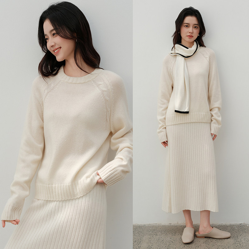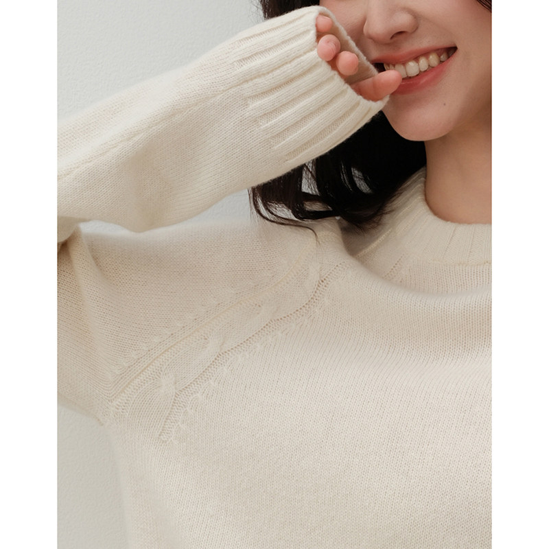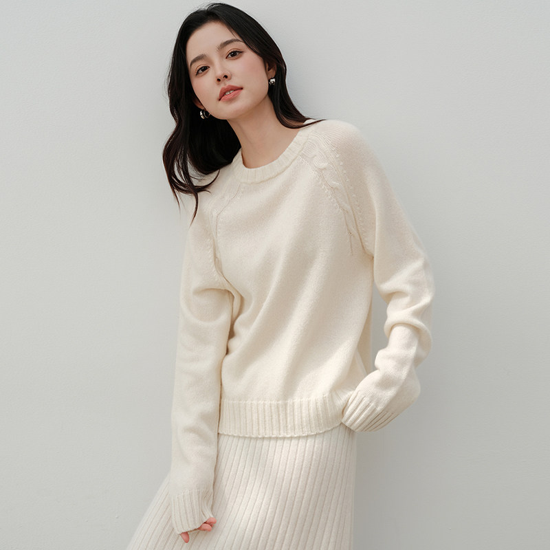 📚 思诺芙德100%山羊绒衫女圆领绞花插肩厚毛衣25秋冬新款白色针织衫