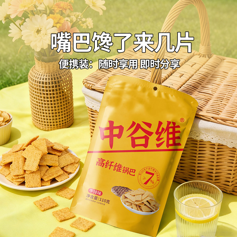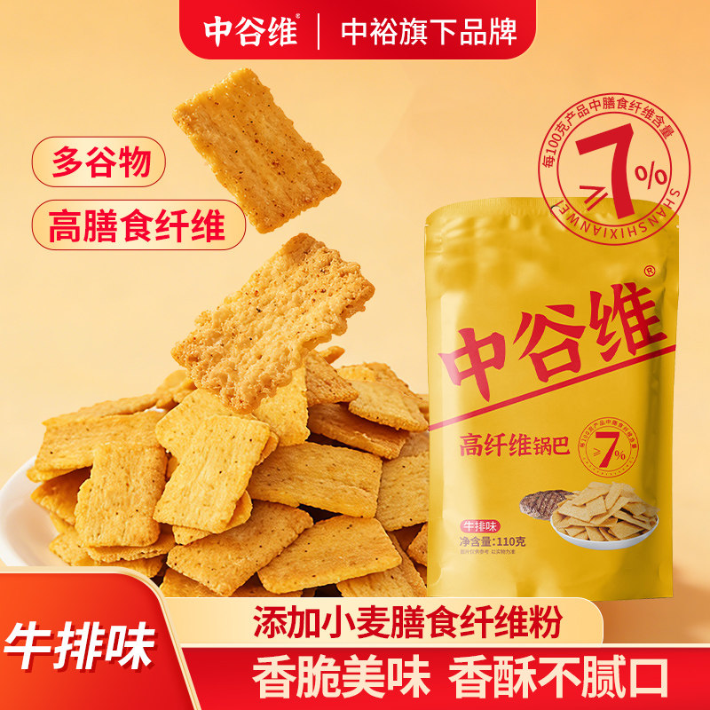 📚 中谷维高纤维锅巴110g*3袋牛排味谷物香脆酥解馋小零食休闲办公室