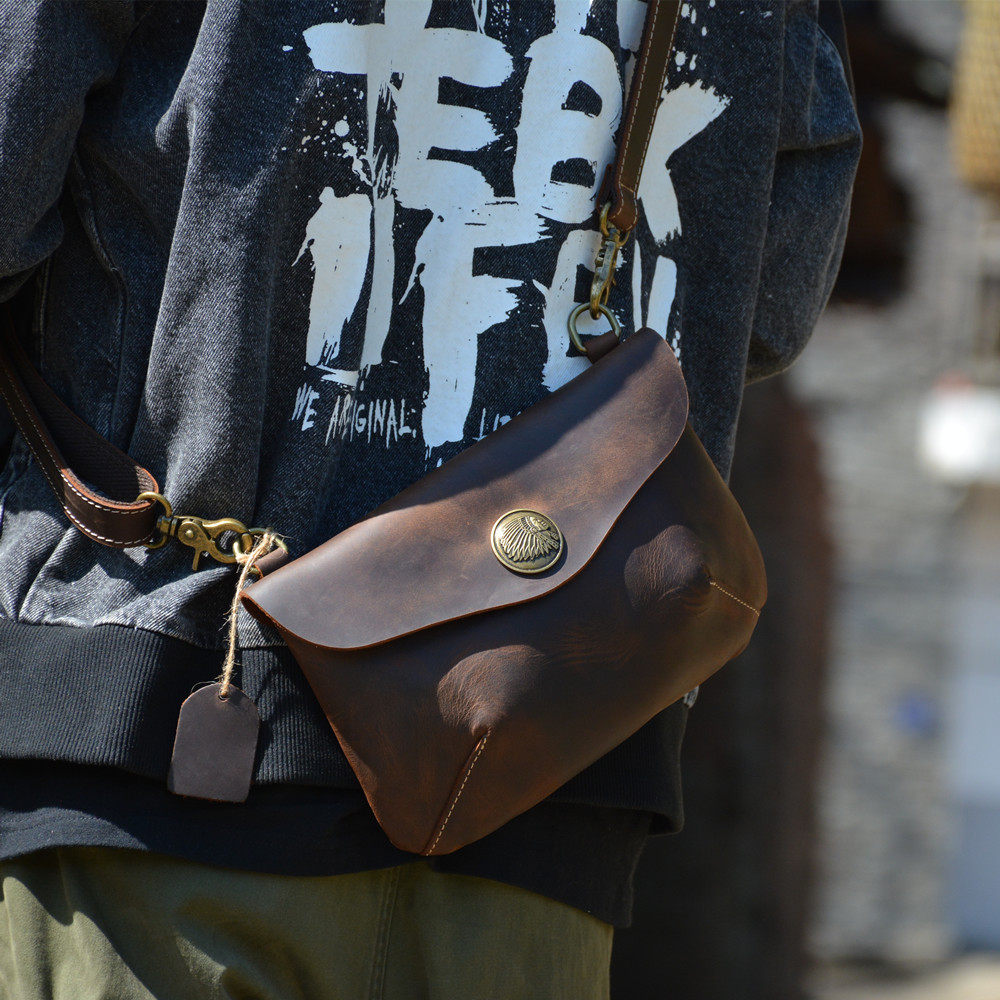 📚 疯马皮简约男士斜挎包休闲复古头层牛皮单肩小包真皮手机包小方包