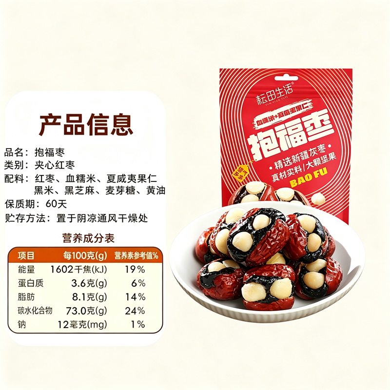 📚 耘田生活抱福枣168g袋装枣夹血糯米夏威夷果仁抱富枣