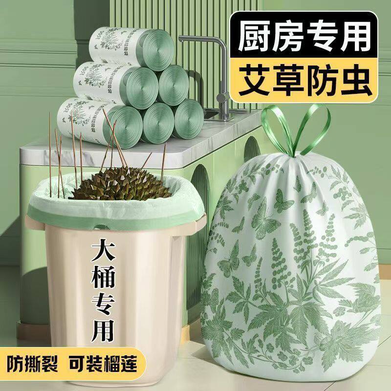 📚 艾草垃圾袋防臭家用加厚手提式抽绳厨房专用耐用大卷塑料袋不易破