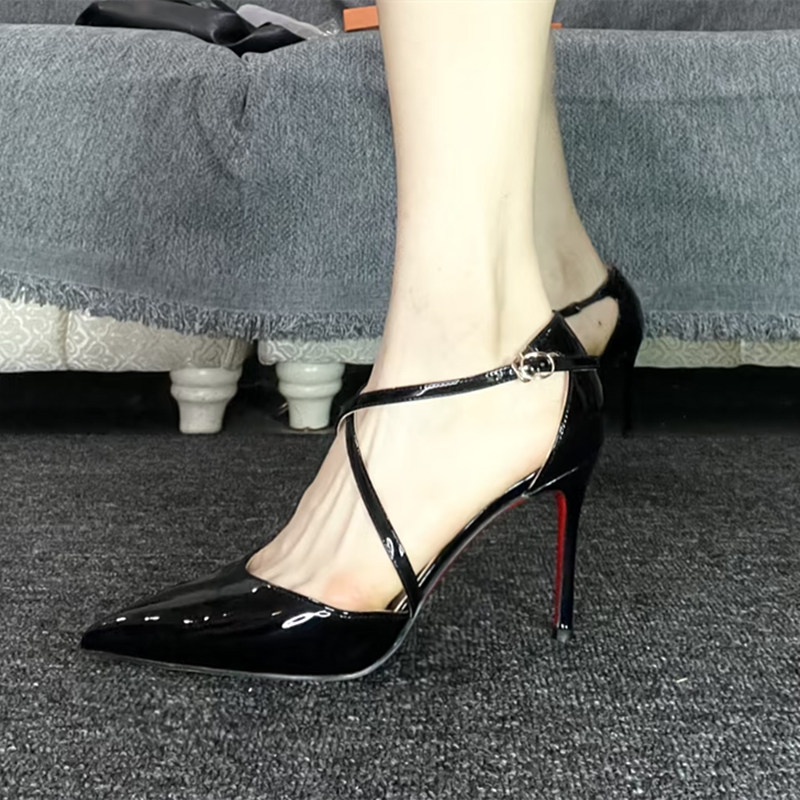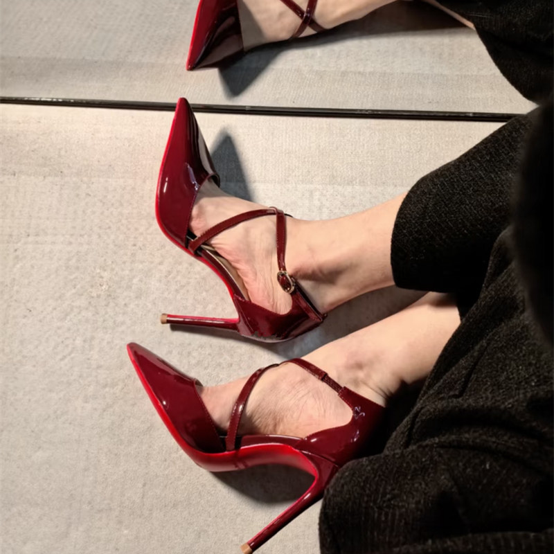 📚 性感绝美酒红色交叉带中空包头凉鞋御姐红底高跟鞋女细跟尖头单鞋