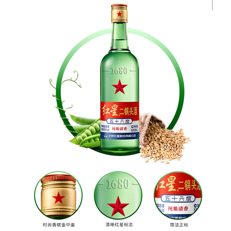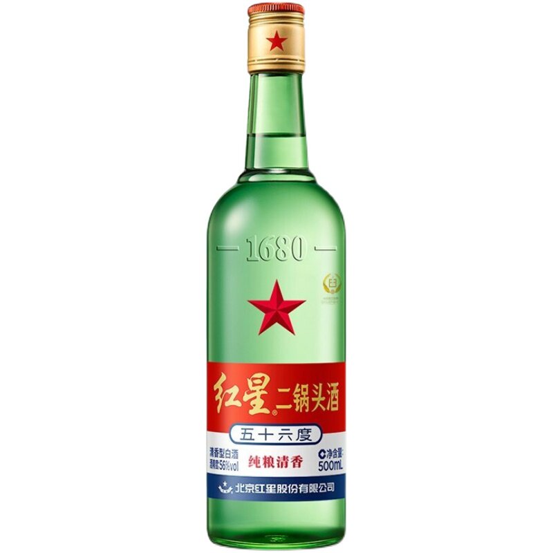 📚 北京红星二锅头 56度 大二绿瓶500ml 清香型高度纯粮食口粮酒白酒