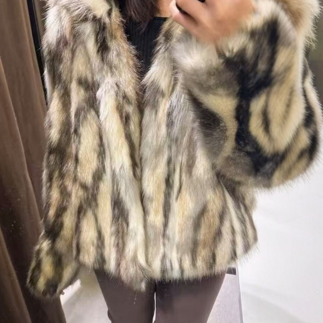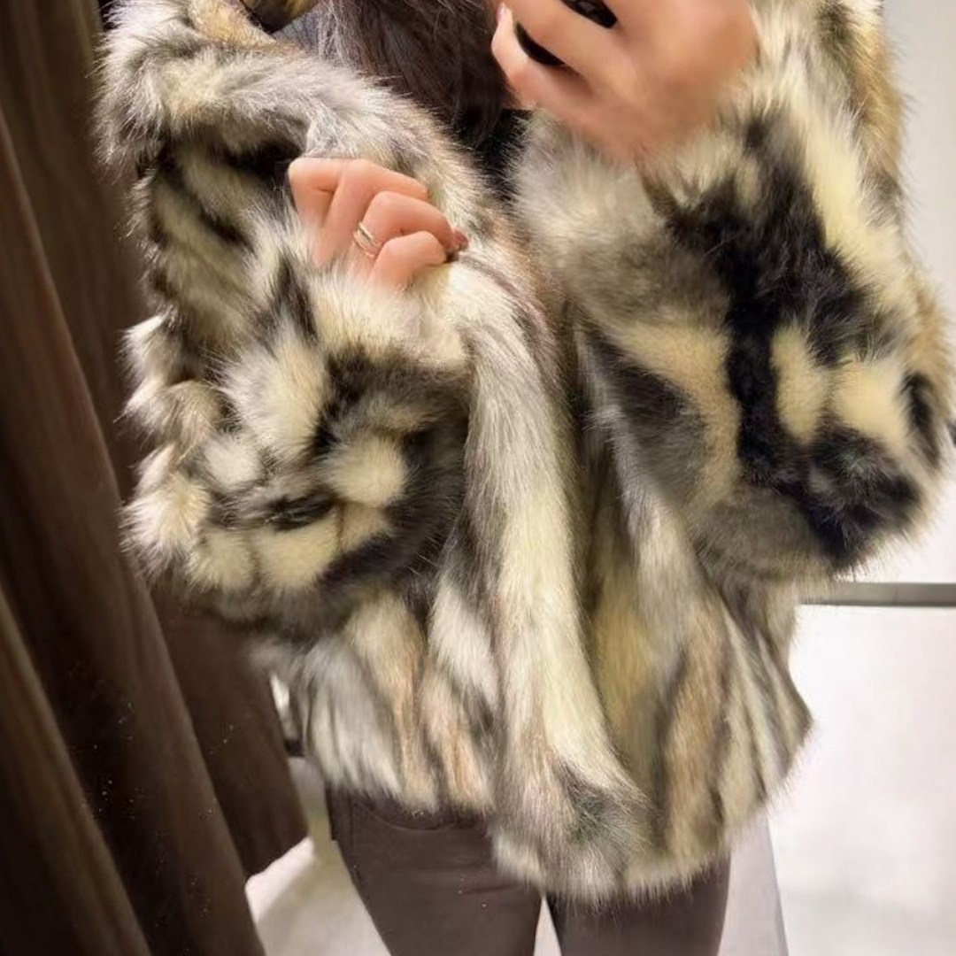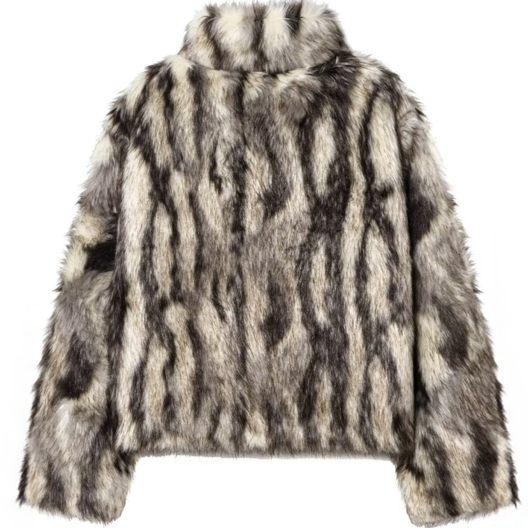 📚 欧美新款环保皮草外套女短款立领黑白斑纹加厚冬仿皮草中长款外套