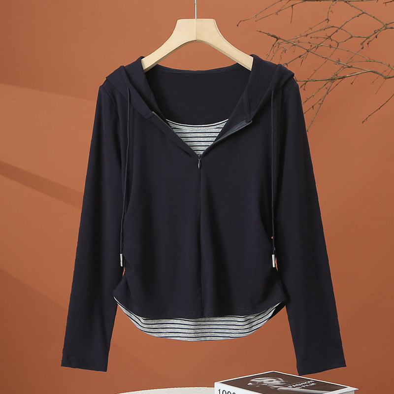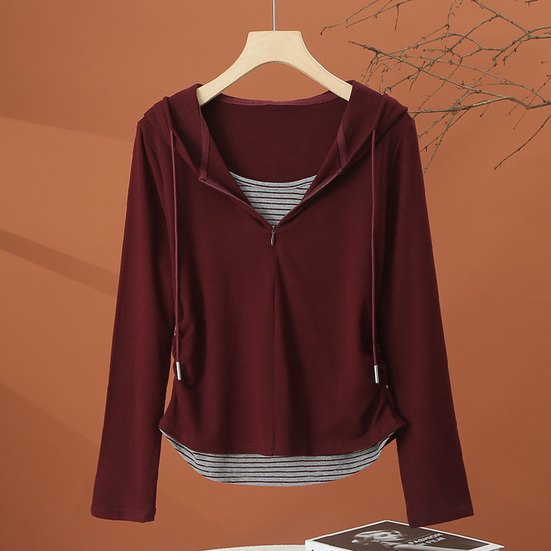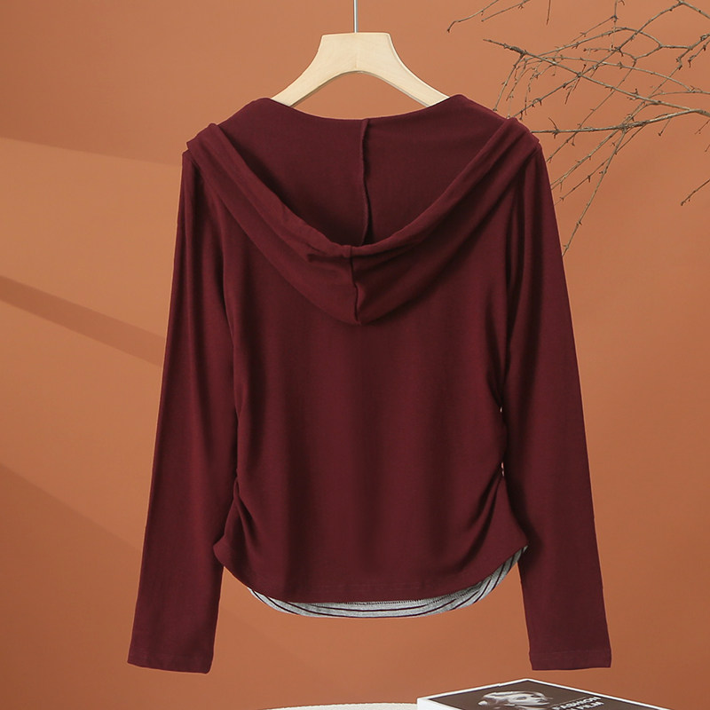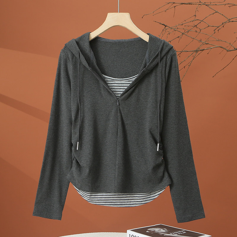 📚 假两件长袖连帽t恤女春季2026新款洋气时尚小衫短款收腰女士上衣