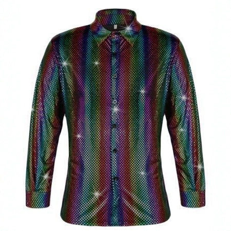 📚 2026新款男士迪斯科服装圆点烫金镭射印花长袖系扣衬衫