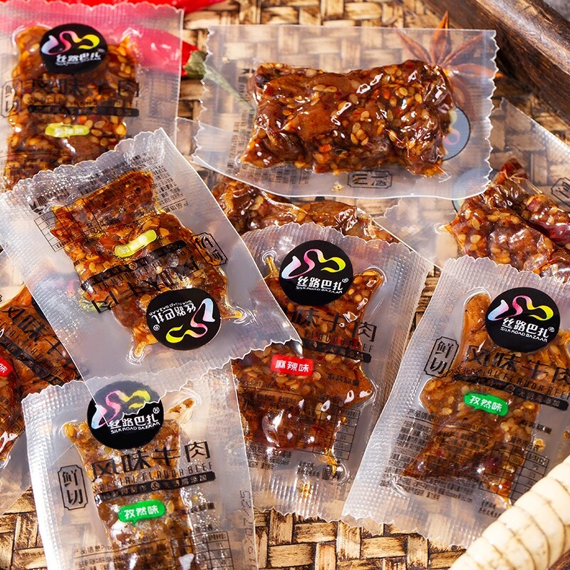 📚 新疆风干真空即食鲜切牛肉干丝路巴扎香辣麻辣孜然袋装熟食500g