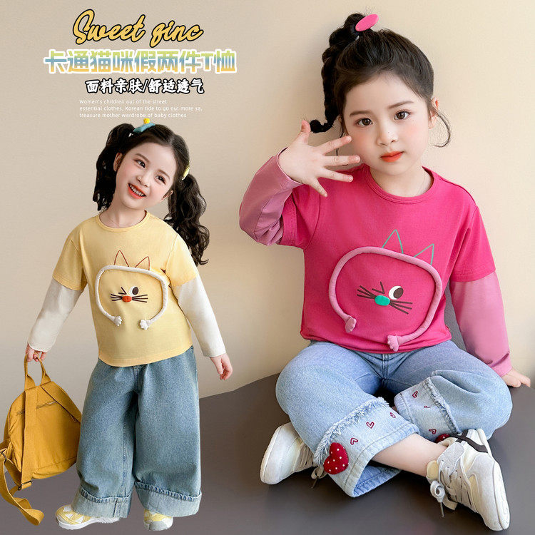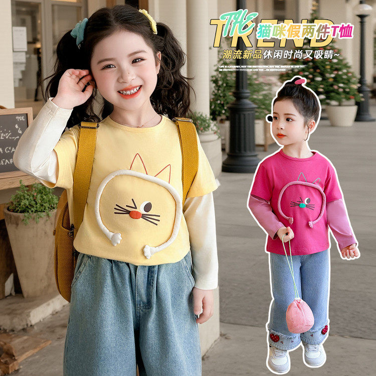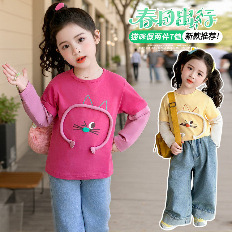📚 女童春秋t恤2026新款儿童洋气卡通长袖女宝宝春季假两件上衣春装T