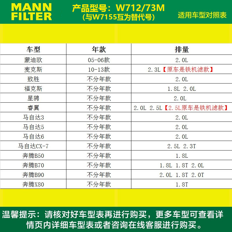 📚 曼牌机油滤芯W7155适用一汽奔腾T33 T55 T77 PRO T99机油滤清器