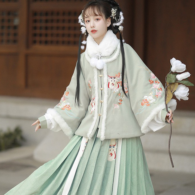 📚 古装秋冬季明制冬装日常古筝演出服绿色成人礼礼服初中生女款汉服