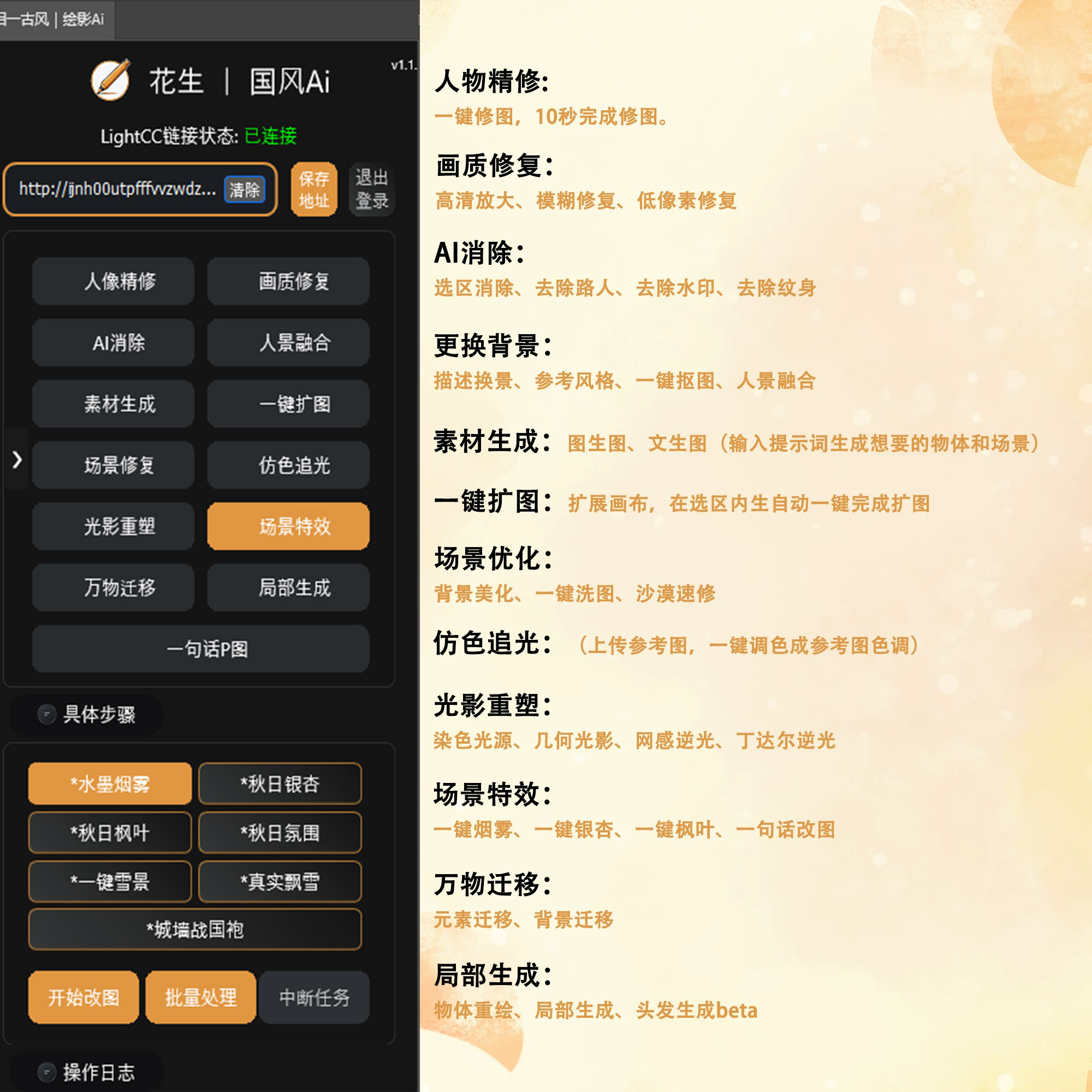 📚 花生国风AI修图 相一插件 绘影aigc一键磨皮换背景溶图飞鱼SD极影
