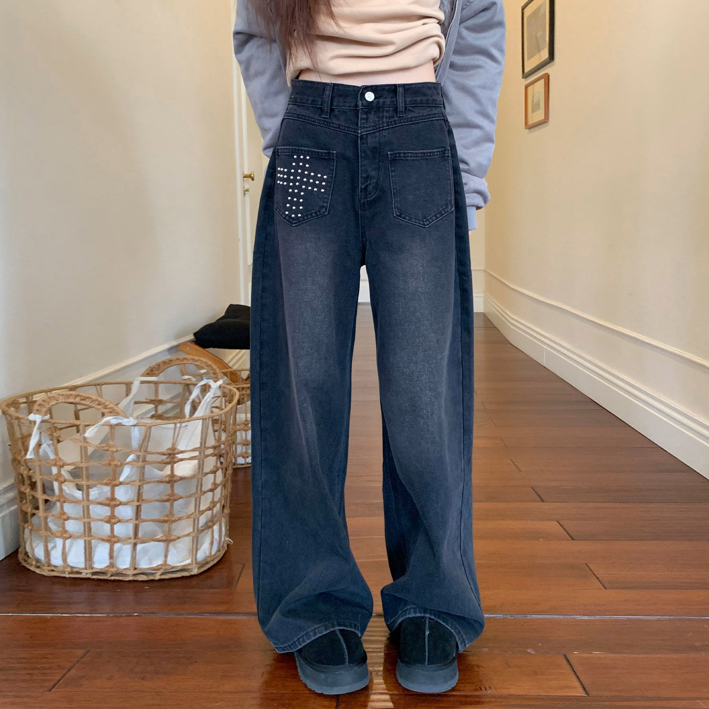 📚 橘子树在哪儿十字架柳钉口袋牛仔裤女秋冬休闲宽松阔腿裤拖地裤子