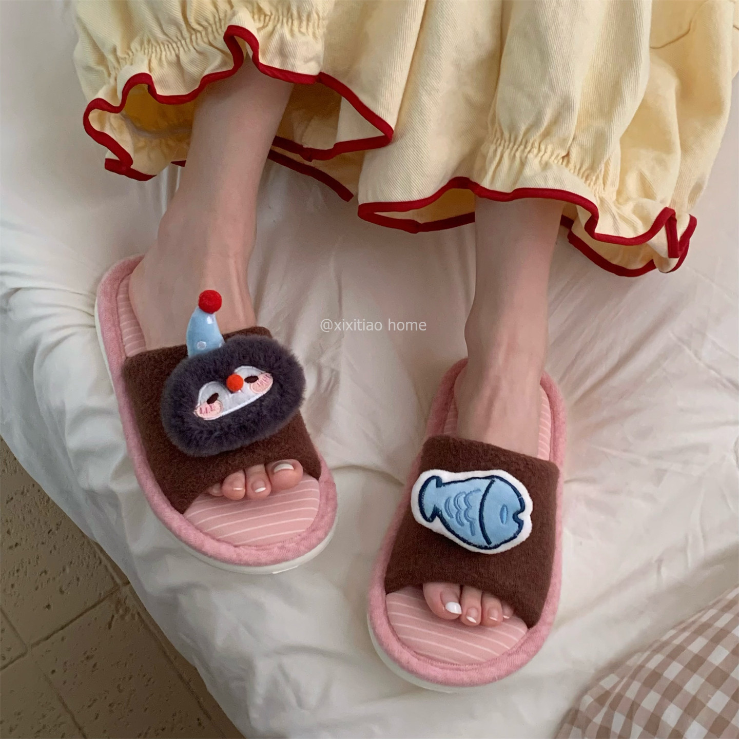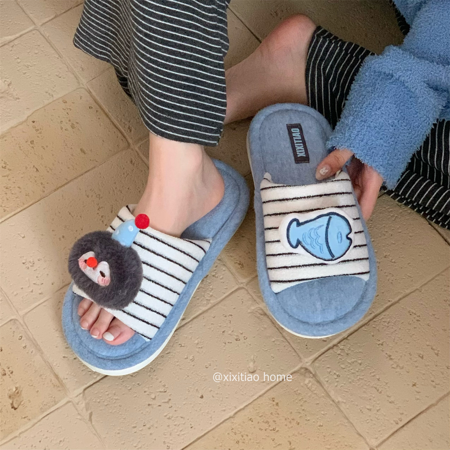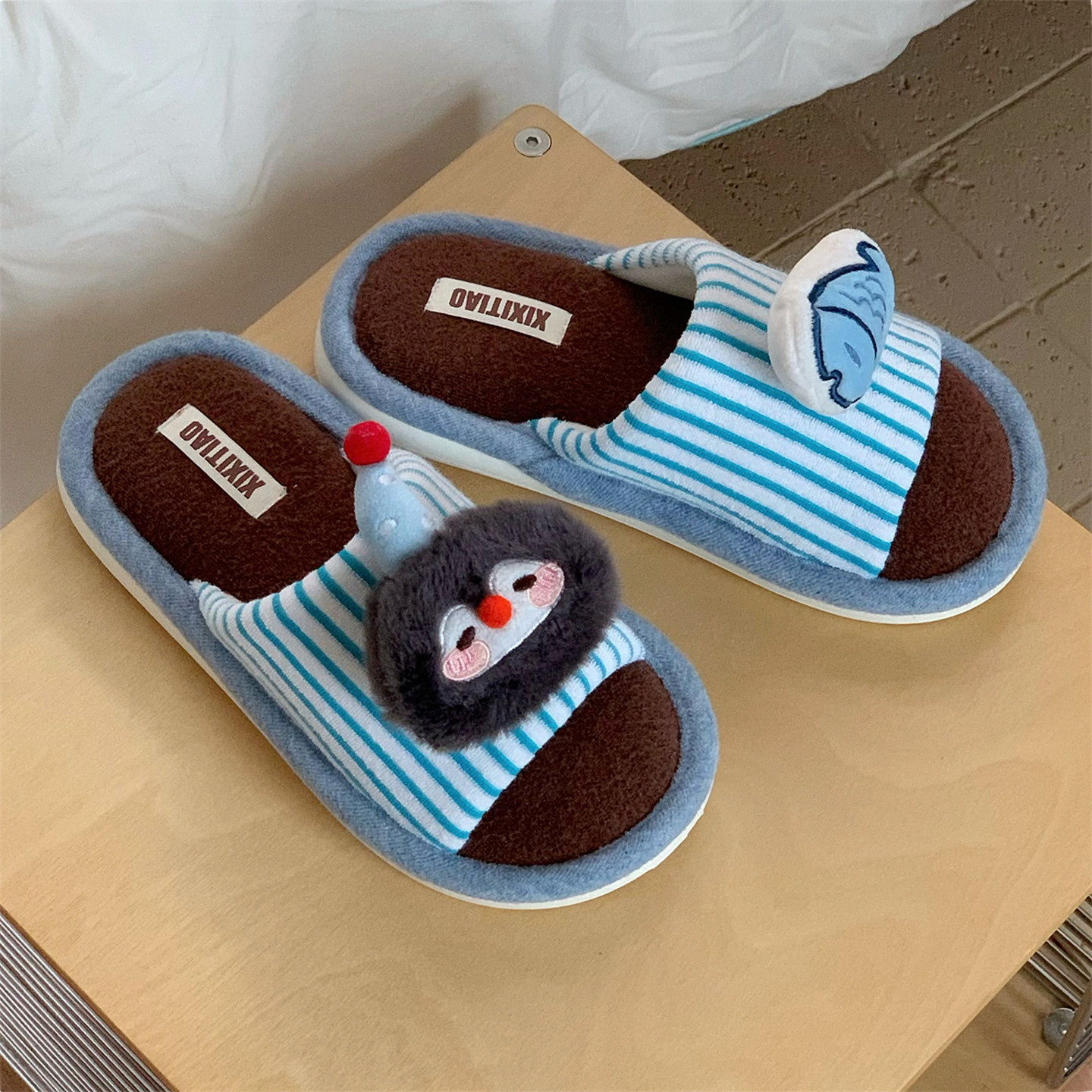 📚 细细条 撞色一字棉拖鞋男女可爱企鹅小鱼秋冬情侣居家防滑地板鞋