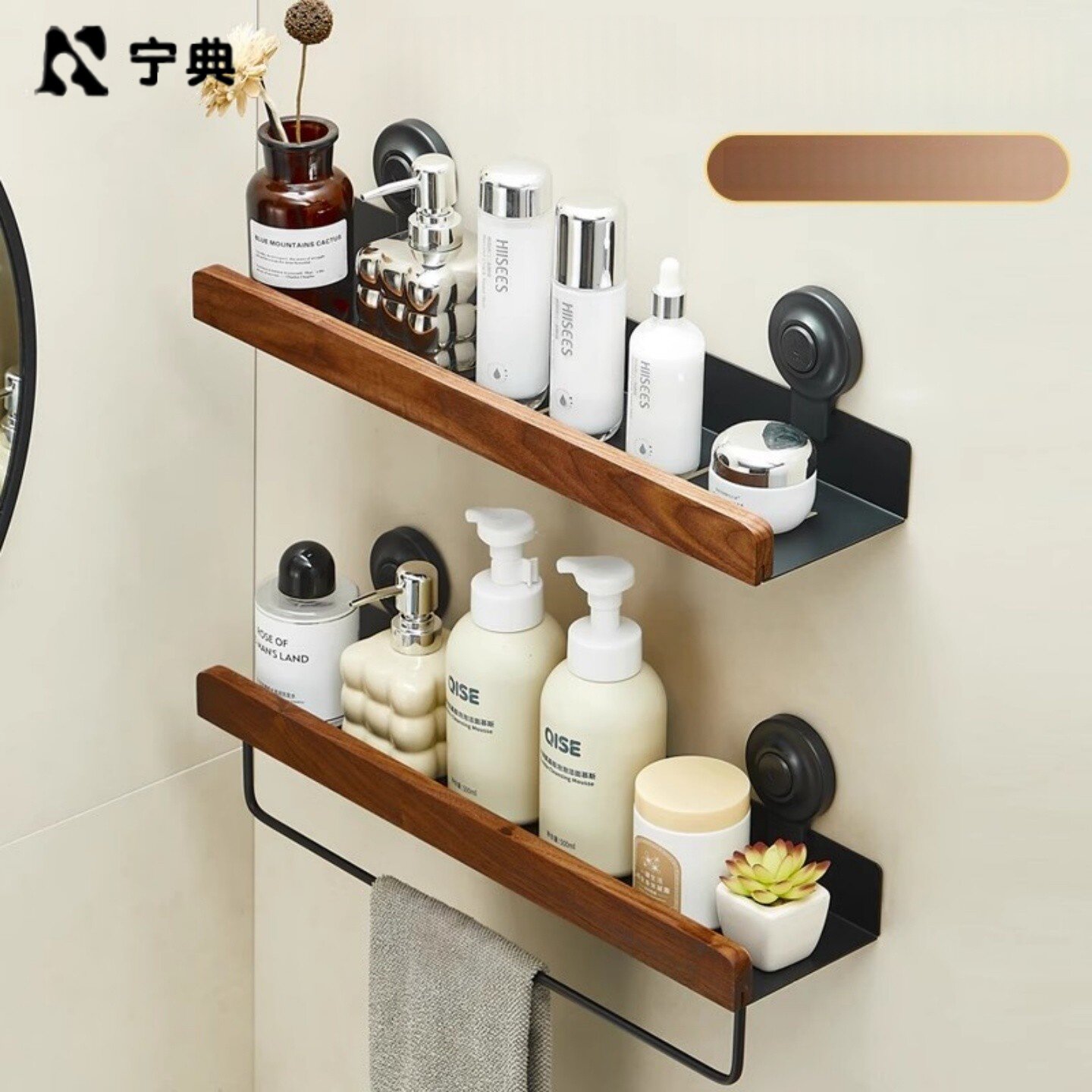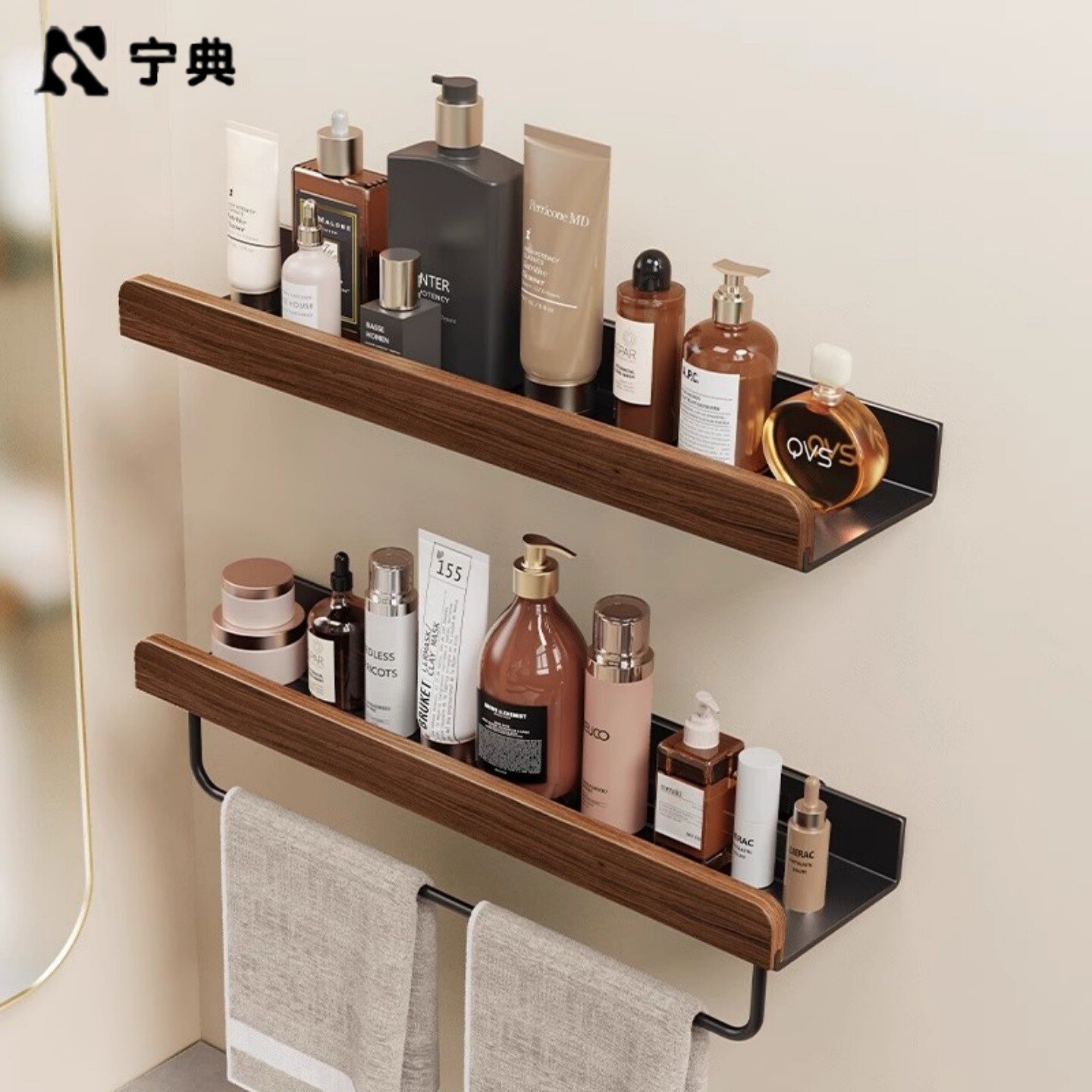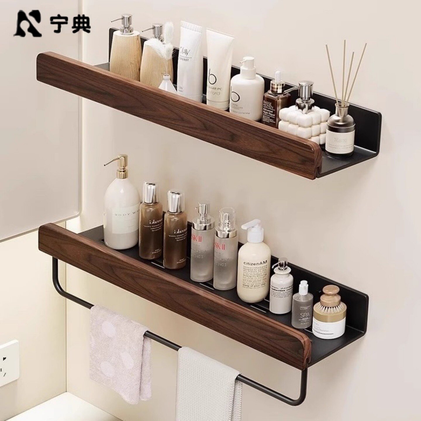 📚 胡桃木卫生间置物架中古风浴室厕所洗漱洗手台洗手间墙上免打孔架