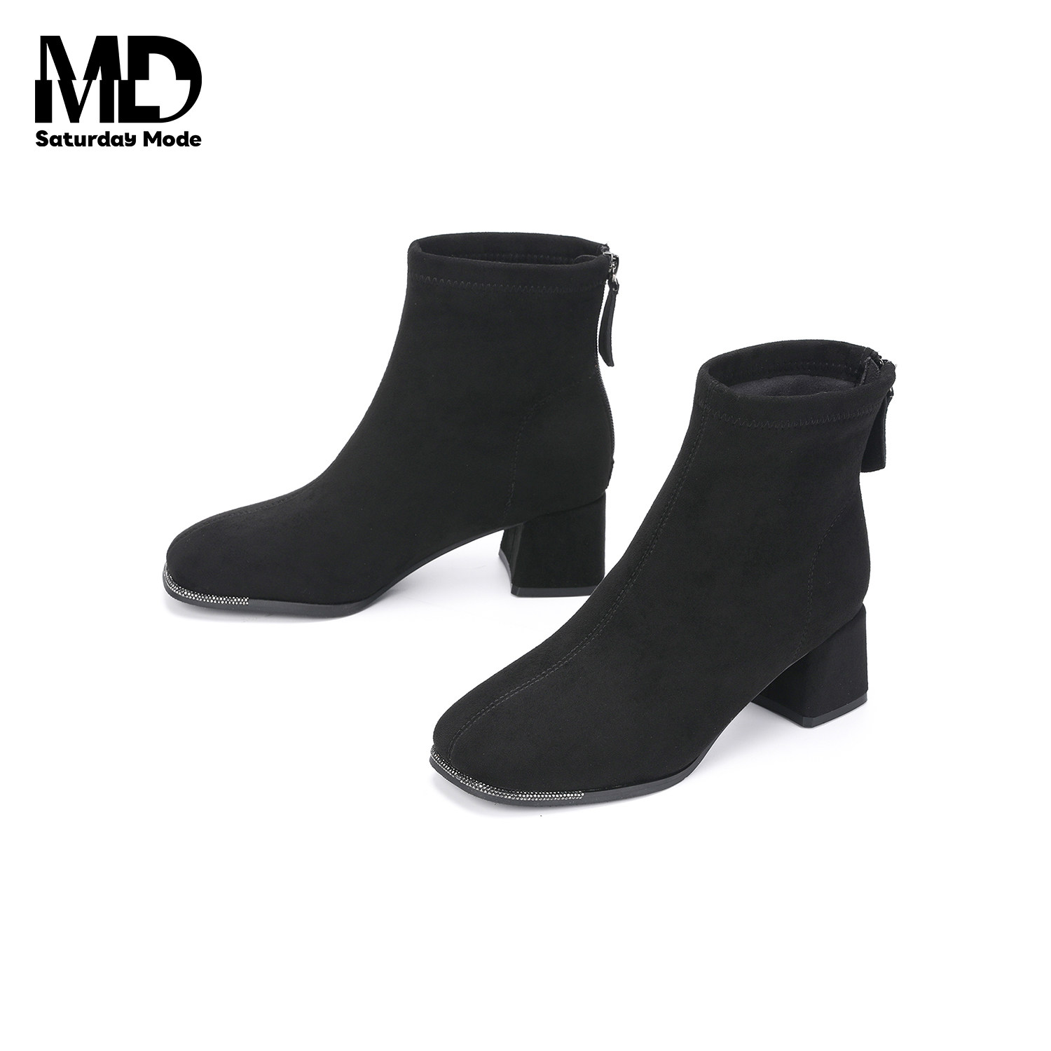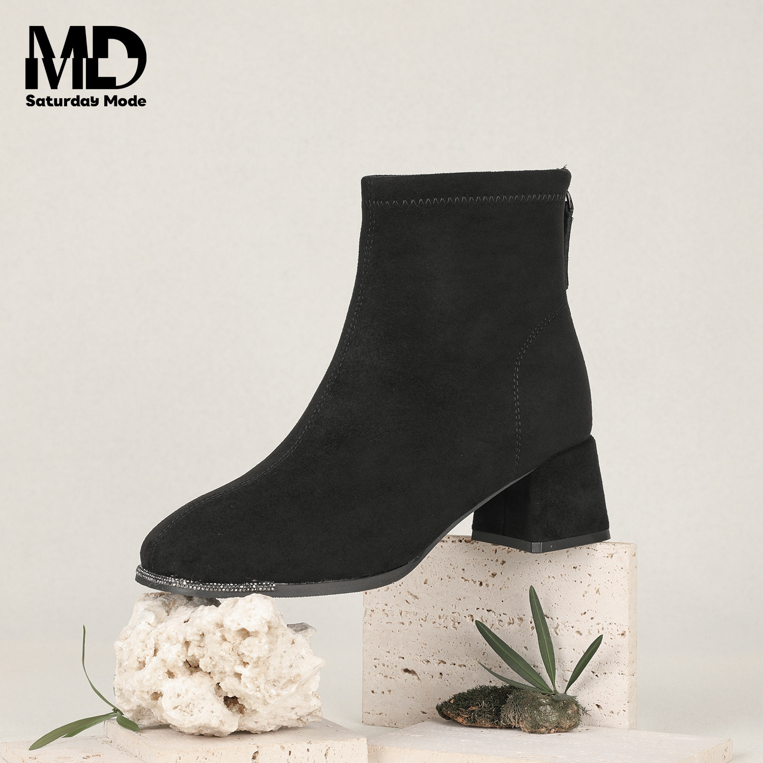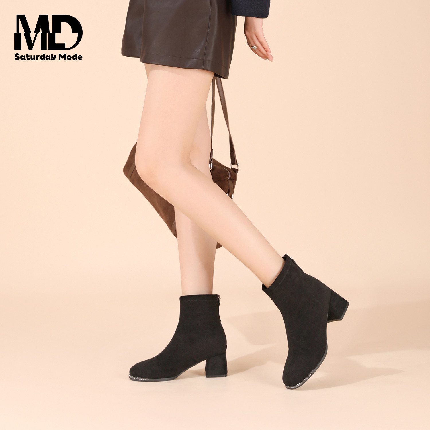 📚 saturdaymode绒面时装靴2025冬季新款闪钻通勤正装粗跟短靴瘦瘦靴
