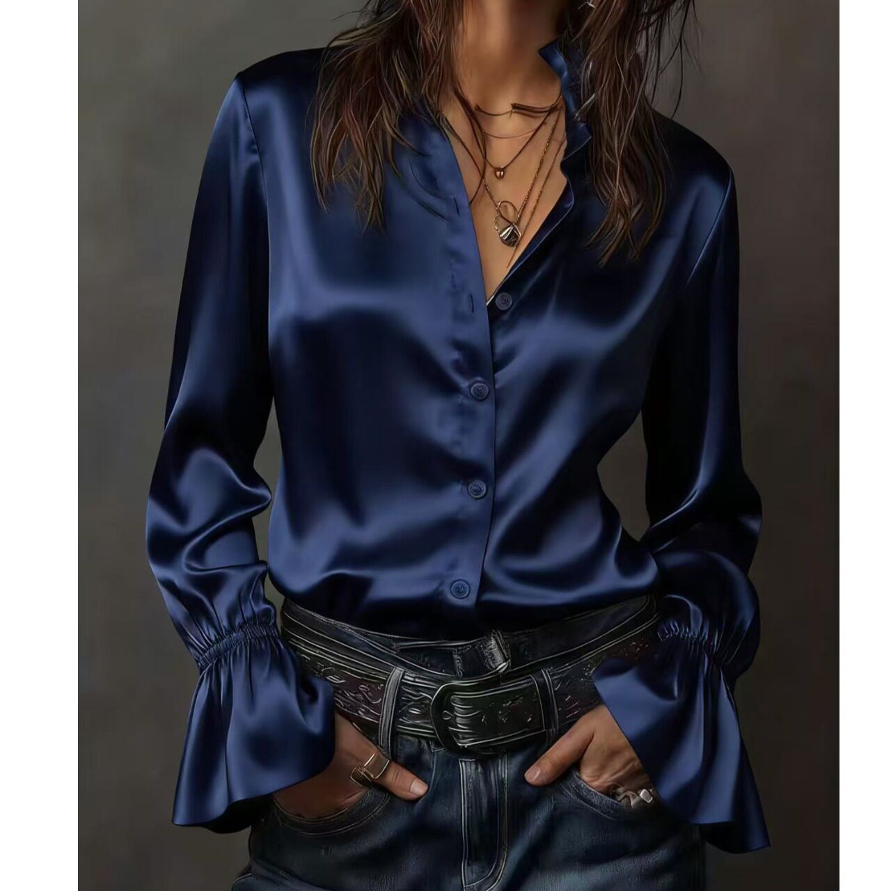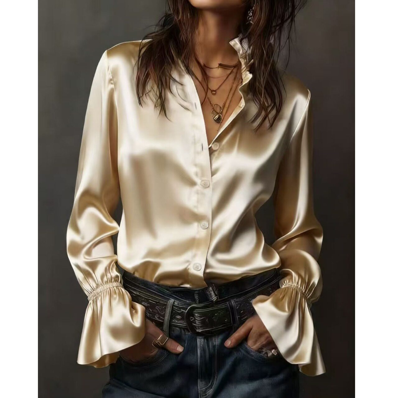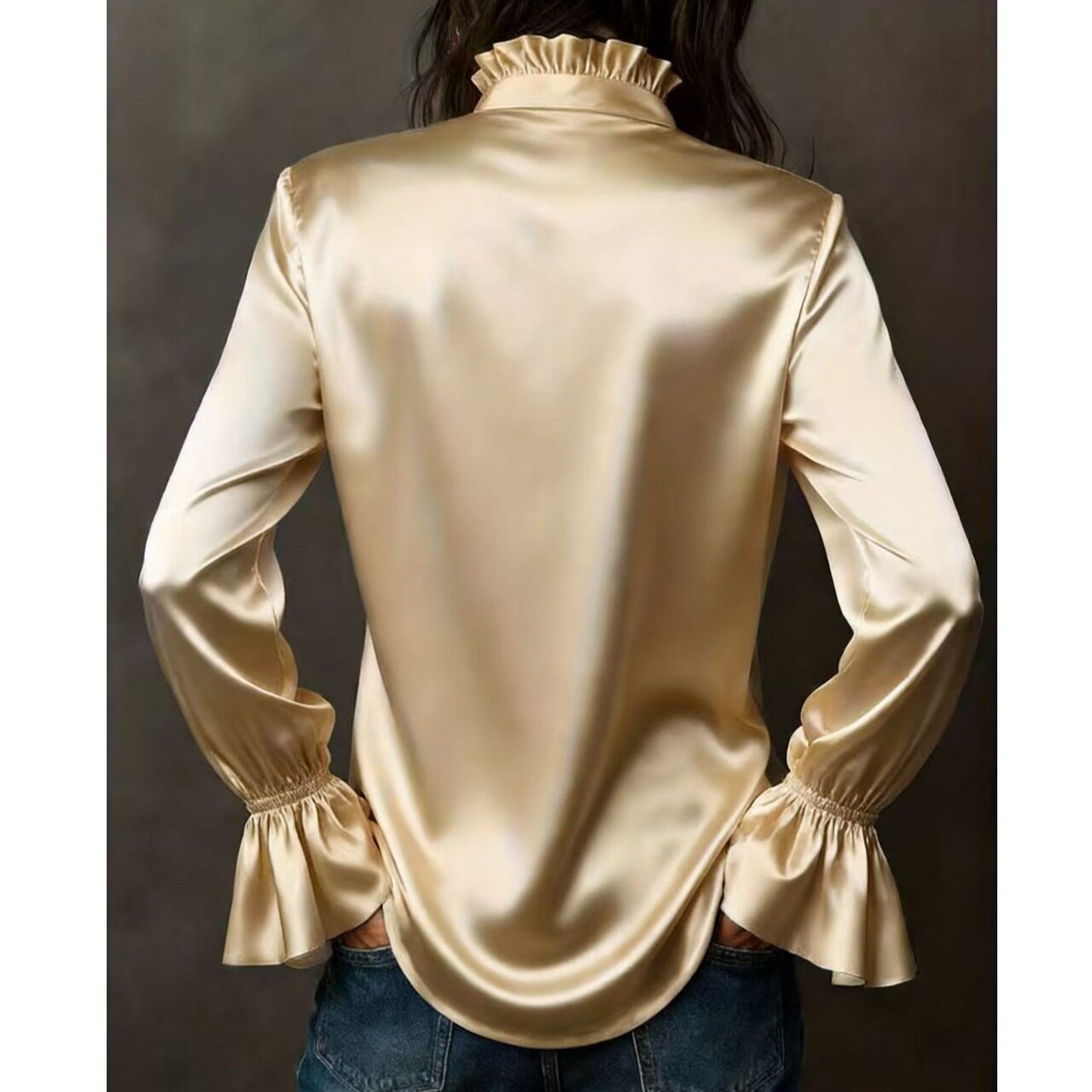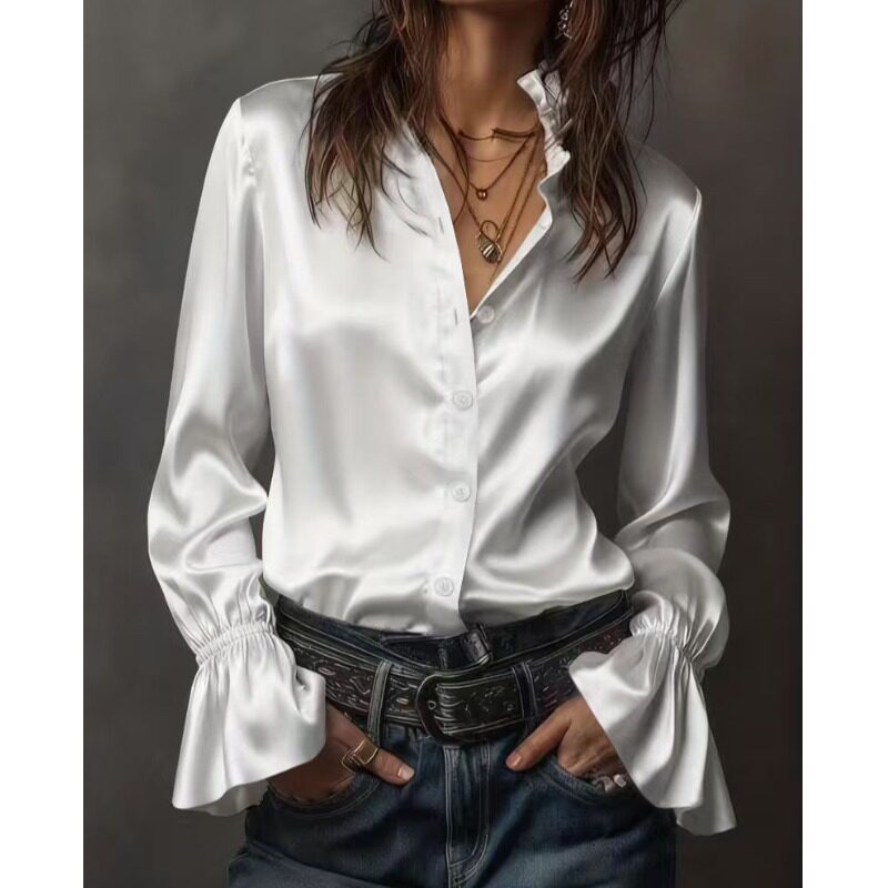 📚 春季新款上班通勤OL时尚欧美风纯色立领单排扣华尔缎长袖衬衫上衣