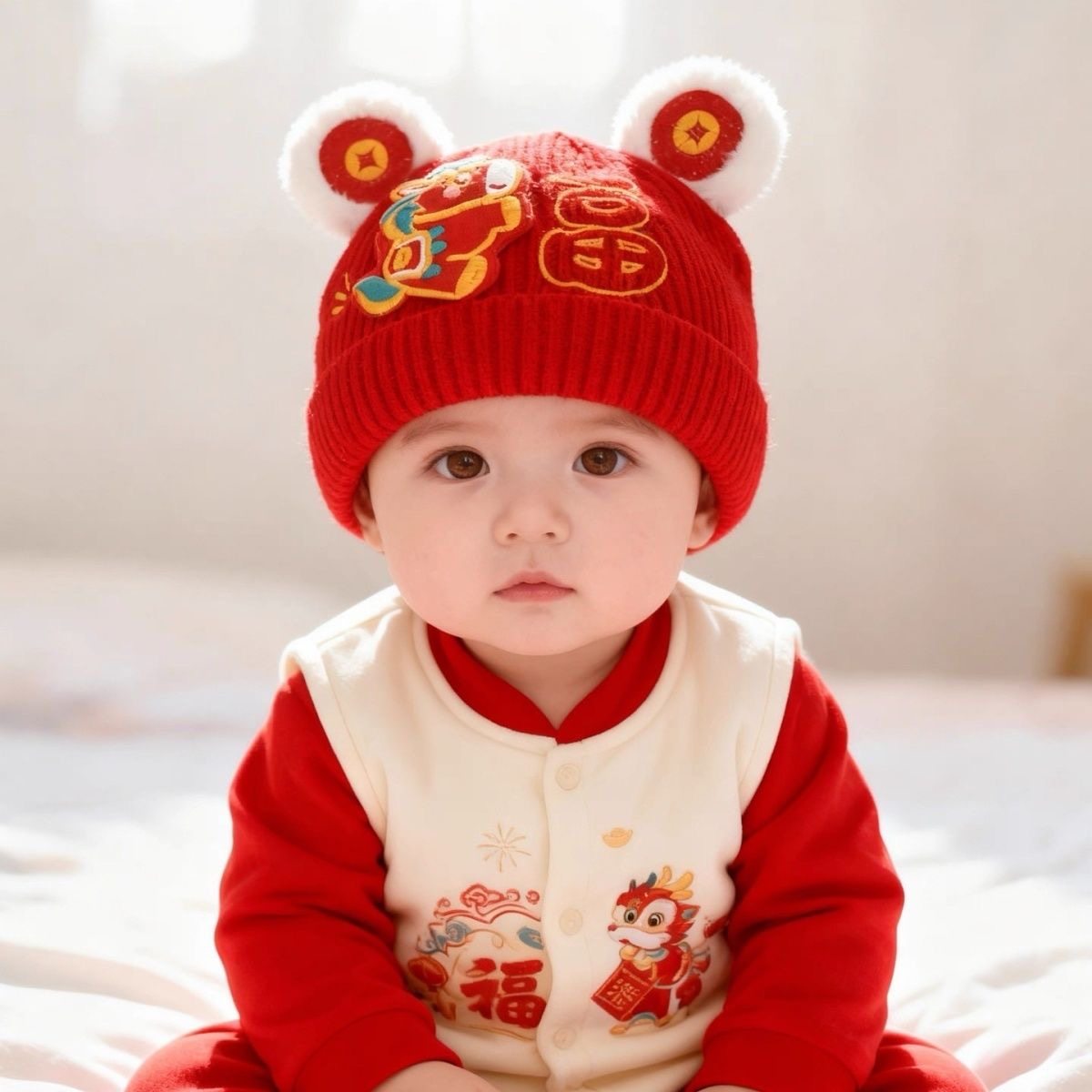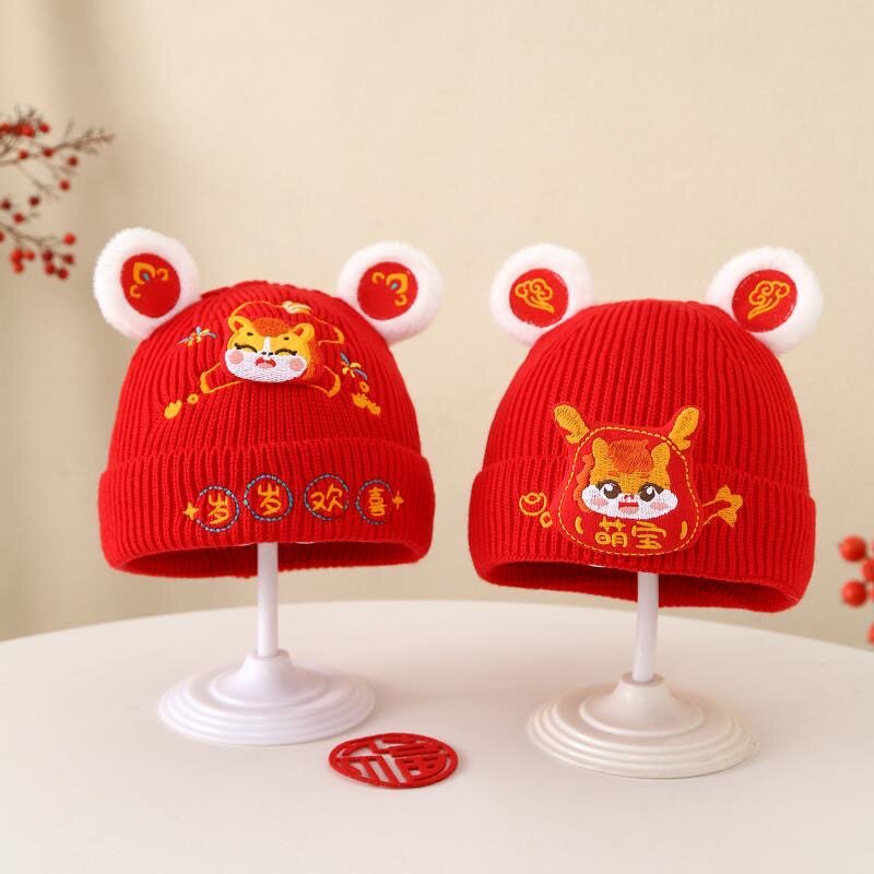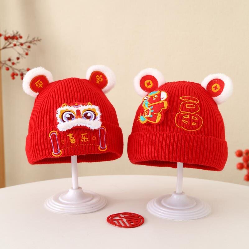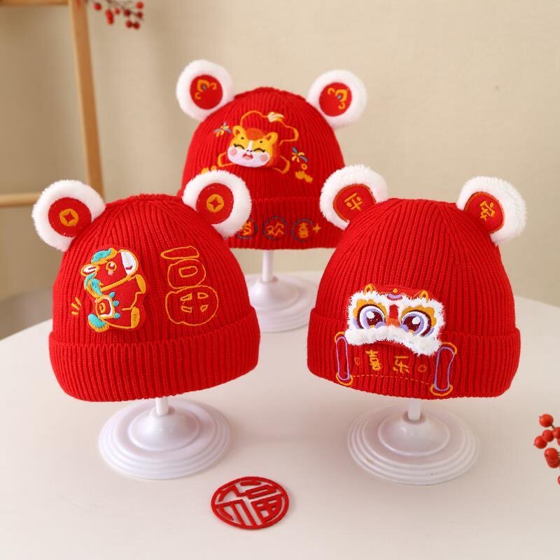 📚 宝宝帽子秋冬季婴儿针织保暖毛线帽红色周岁喜庆过年新年婴幼儿厚